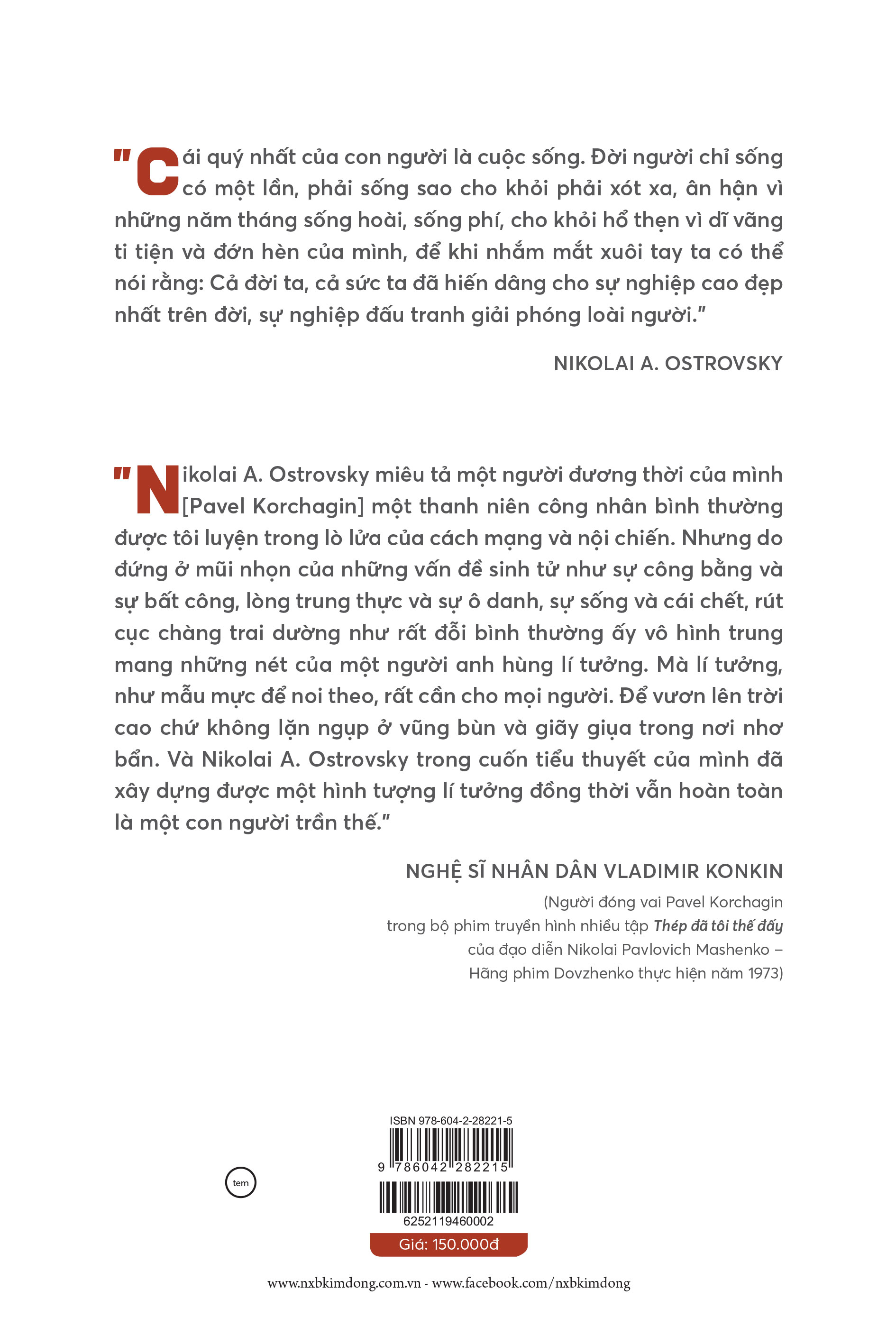 “Thép đã tôi thế đấy” là một trong những tác phẩm nổi tiếng nhất của văn học Nga Xô viết. Suốt hơn chín mươi năm kể từ lần xuất bản đầu tiên (1932) đến nay, dù trải qua nhiều biến cố, nhưng cuốn tiểu thuyết về người thanh niên Pavel Korsaghin với lí tưởng sống cao đẹp và ước mơ hiến dâng tuổi thanh xuân cho đất nước, quê hương vẫn được bạn đọc mến mộ, trân quý. Cuốn tiểu thuyết đặc biệt được viết bởi một con người đặc biệt, trong một hoàn cảnh đặc biệt. Tác giả của nó, nhà văn Nikolai Ostrovsky là thương binh, bị bệnh nặng, bị hỏng mắt và nằm liệt giường. Không chịu khuất phục số phận, ông đã miệt mài vẫn viết những dòng nhiệt huyết của trái tim tuổi trẻ cho đến hơi thở cuối cùng.