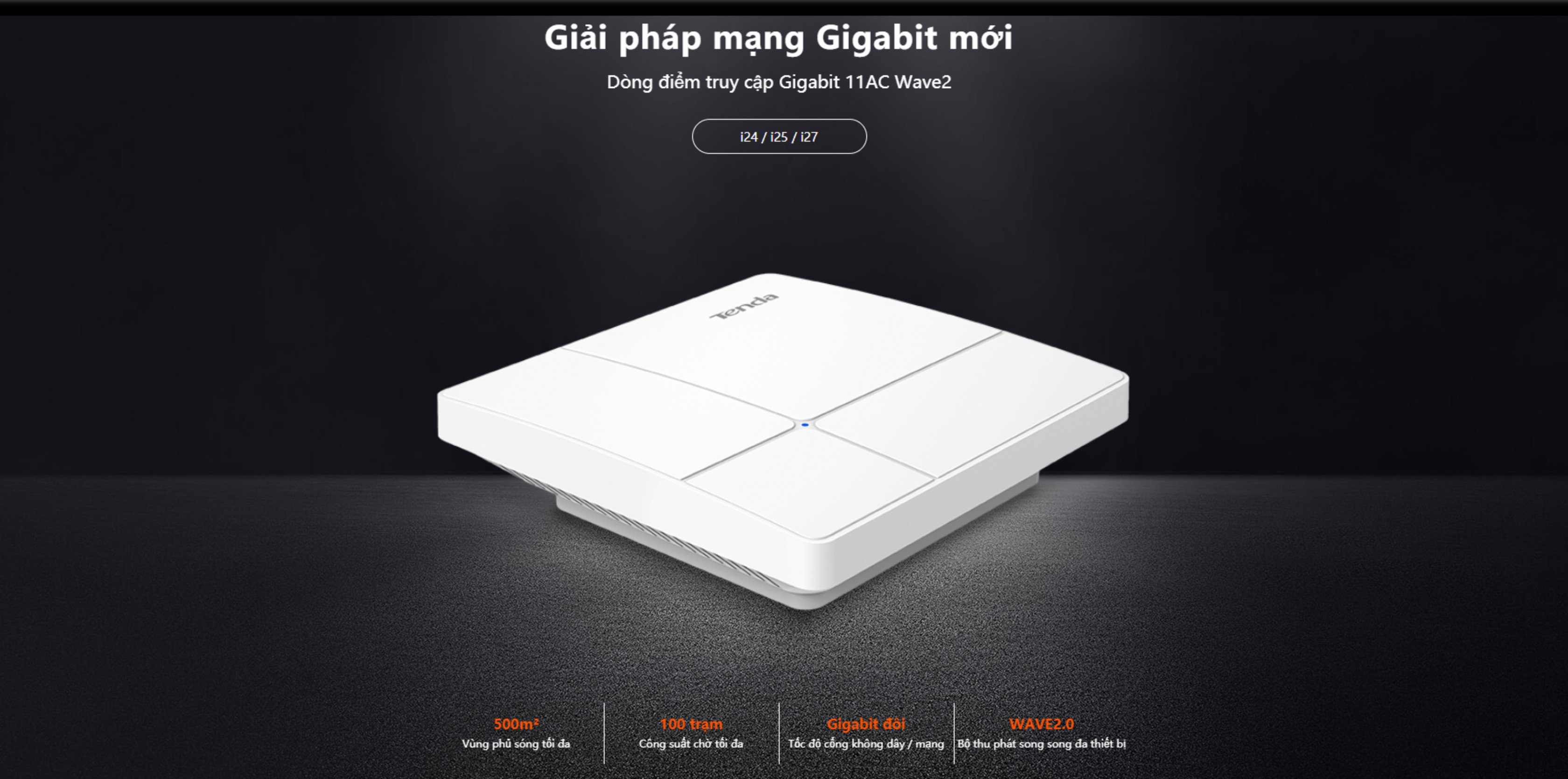 Tenda I24 Giải pháp mạng Gigabit mới: Phủ Sóng upto 300m2 (ngang), upto 100user dùng cùng lúc, Công nghệ Gigabit đôi giúp truy cập với băng thông mượt mà, sóng WAVE2 kết nối đa phương tiện cùng lúc cho trãi nghiệm không bị gián đoạn, Cổng 1000M cho phép trãi nghiệm internet nhanh nhất