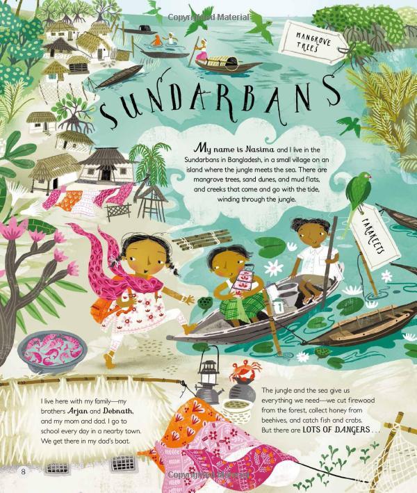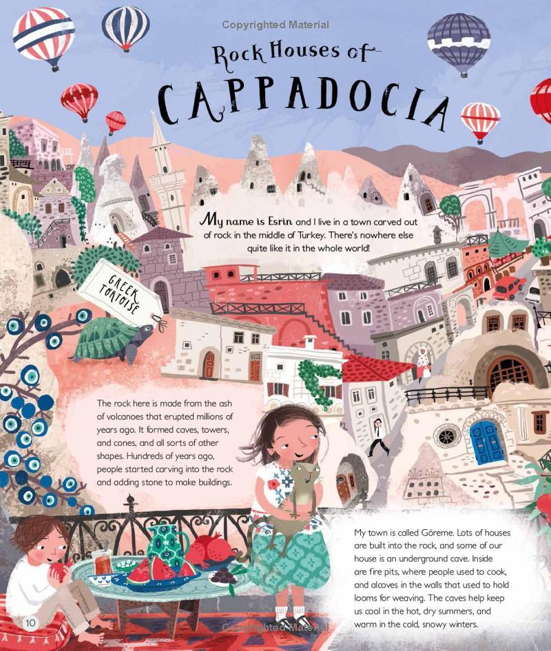 The guides are children who tell us about the animals, plants and weather that they encounter; the feasts and festivals they enjoy; and the clothes they wear, the way they learn, the languages they speak, and the sports and games they play. The tour is truly global, as we journey from Australia’s desolate Red Centre to bustling Beijing, from the windswept Outer Hebrides to the rock houses of Cappadocia in Turkey, via the Amazon rainforest, New York City, the Siberian tundra, and a floating village in Cambodia.