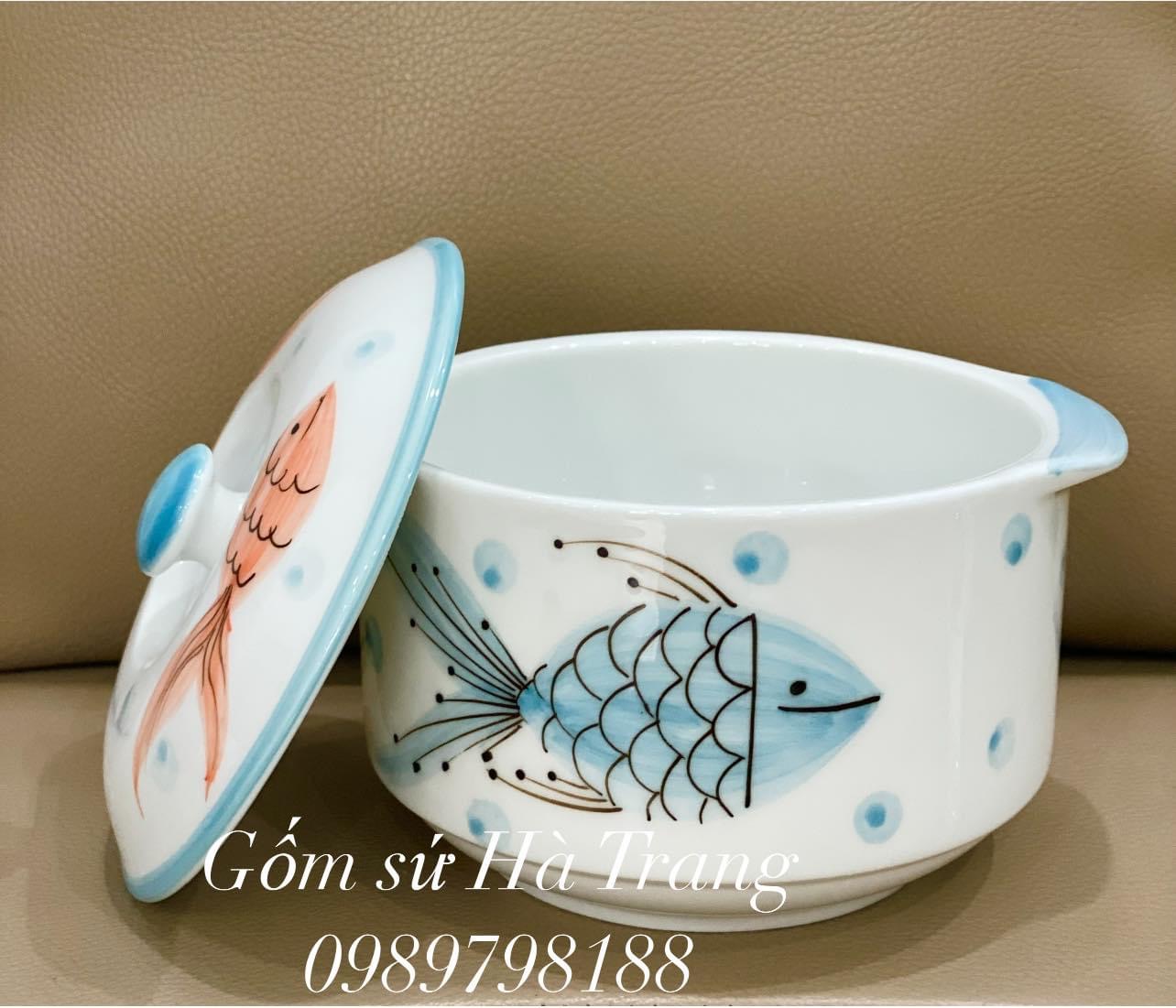 ✨Thố chưng yến gốm sứ Bát Tràng cao cấp vẽ tay hoạ tiết cá dung tích 600ml