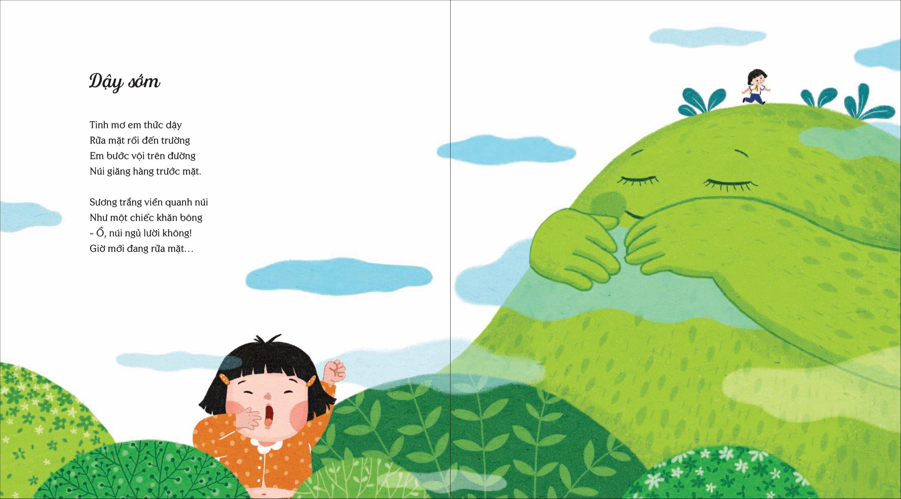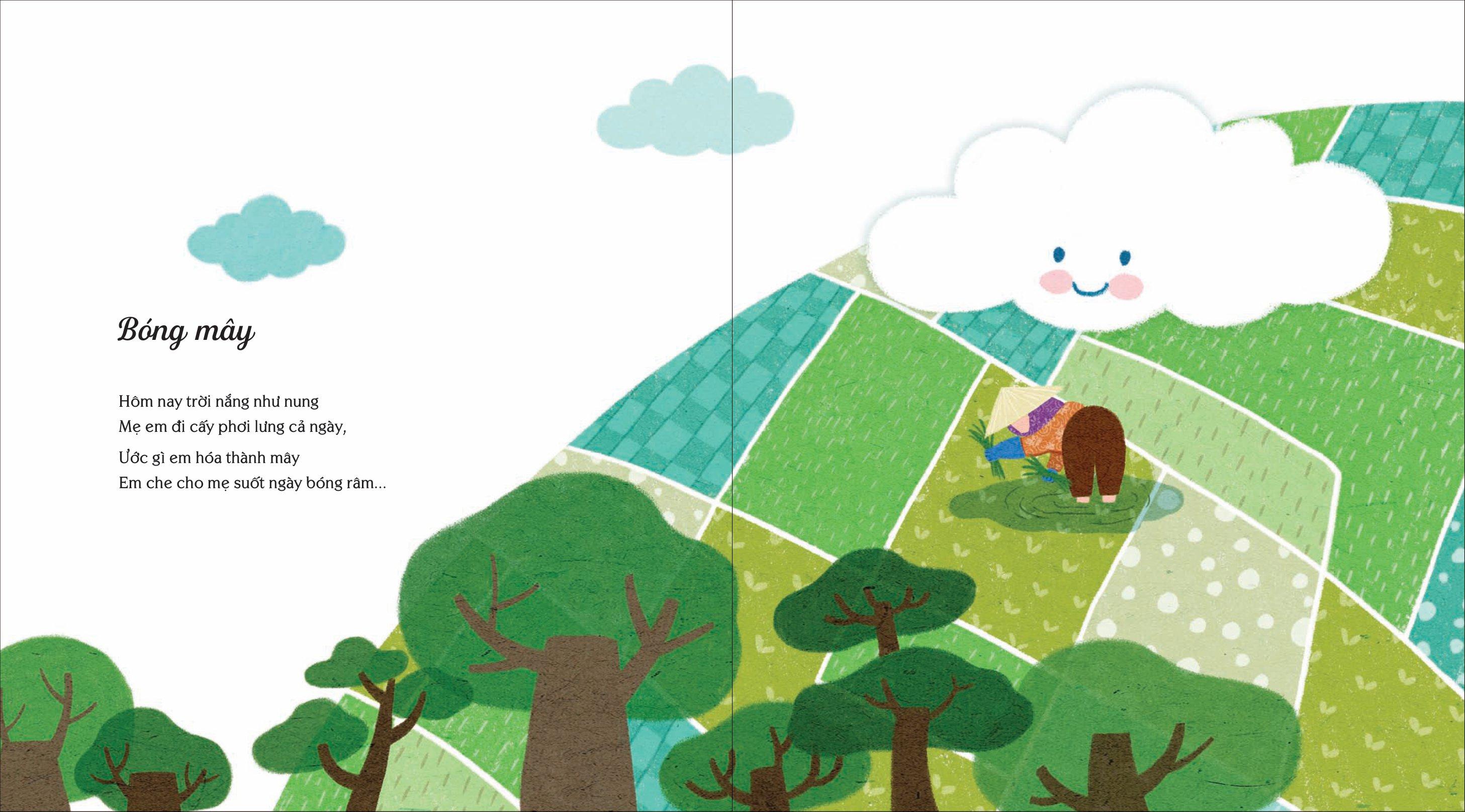 Bóng mây như một khu vườn thơ mến thương và ngộ nghĩnh, có chú gà trống ngắm bông hoa mào gà mà hoảng hốt kêu: “Ai lấy mào của tôi/Cắm lên cây này thế?”, có những cây nấm hương, mộc nhĩ đi làm cỗ khắp nơi, có cành đào tặng nội cầm mùa xuân trên tay, có trái cau là kẹo của bà, có quả thị treo trên bàn học làm sáng một vầng trăng trong trang sách em mở ra và có hương cốm lá sen chứa cả quê hương nắng đượ