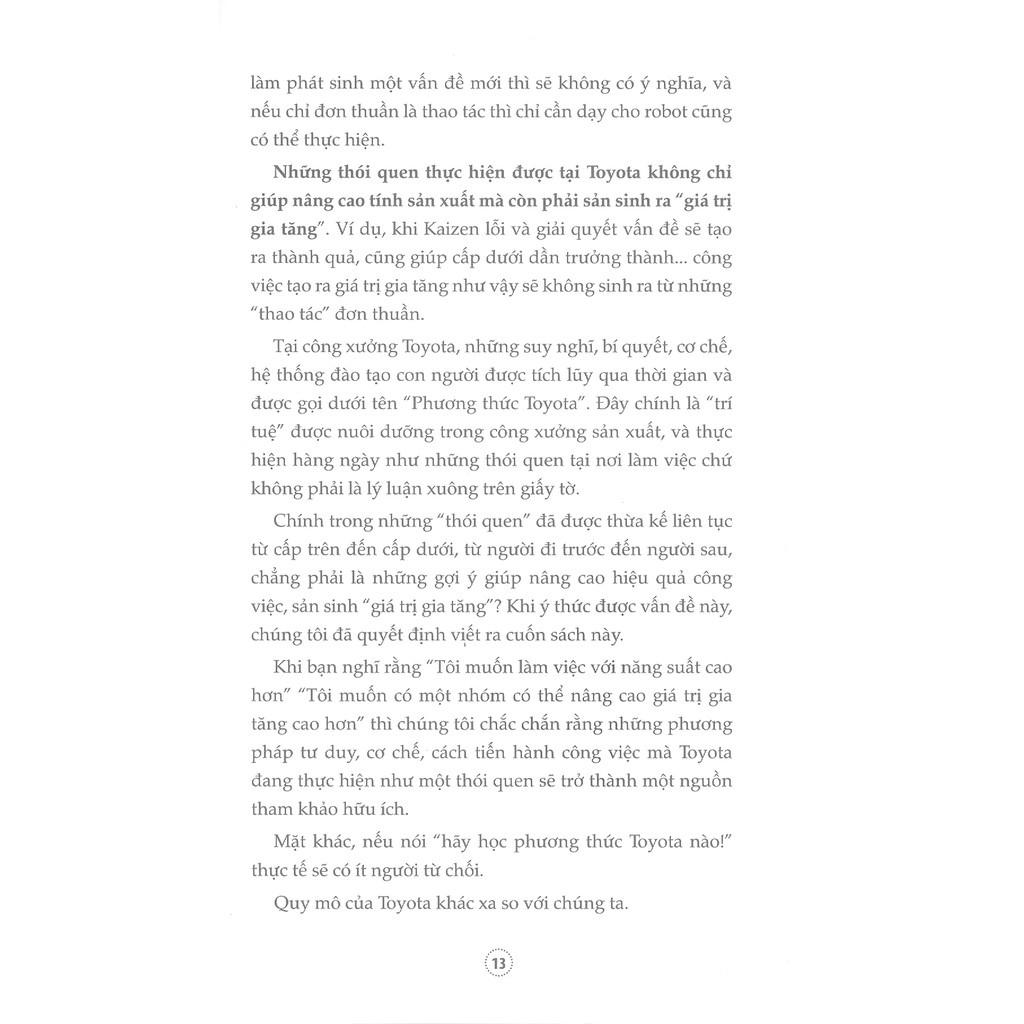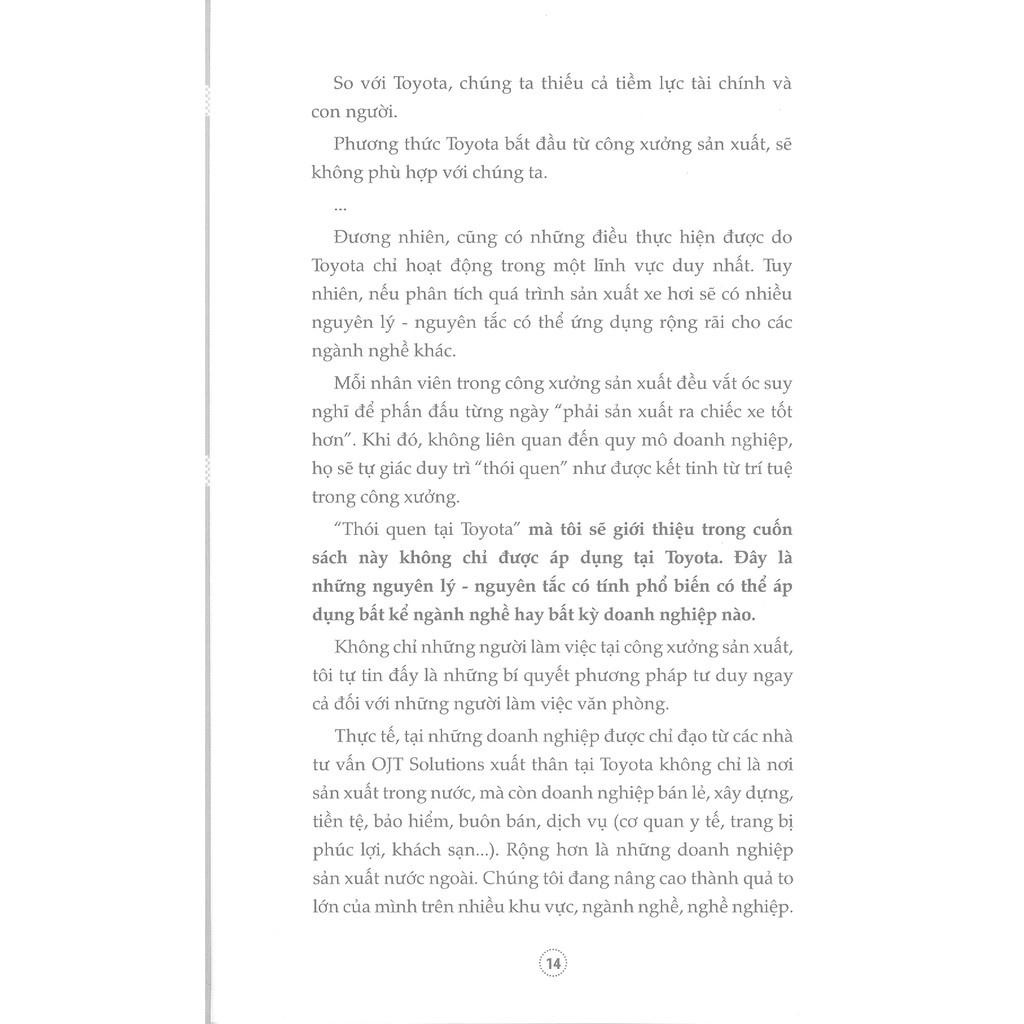 Cuốn sách "Những thói quen tại Toyota" mà tôi sẽ giới thiệu trong cuốn sách này không chỉ được áp dụng tại Toyota. Đây là những nguyên lý - nguyên tắc có tính phổ biến có thể áp dụng bất kể ngành nghề hay bất kỳ doanh nghiệp nào.