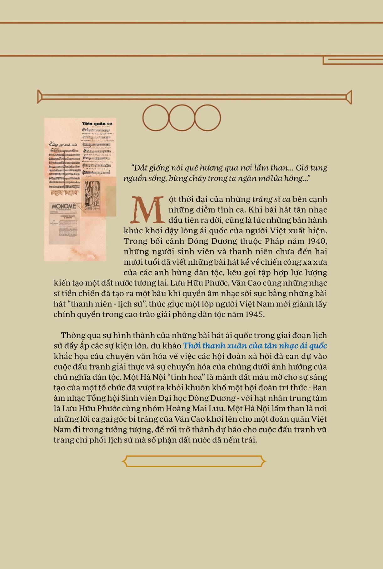 Nghiên cứu cũng khảo sát cuộc chuyển hóa của các tổ chức vốn dĩ gập ghềnh trước những vấn đề phân ly ý thức hệ xảy ra. Hà Nội là bối cảnh địa lý chính cho những hoạt động này diễn ra, và cũng mau chóng trở thành một chiến địa văn hóa khắc nghiệt trong suốt thập niên 1940 và cho đến tận những năm 1950 khi hòa bình lập lại ở miền Bắc. Cuối cùng, khi tập trung tìm hiểu các sản phẩm của Ban âm nhạc Tổng hội sinh viên Đông Dương với người đại diện là Lưu Hữu Phước, cũng như Văn Cao và nhóm Đồng Vọng cùng các hội đoàn văn hóa giáo dục trong thời điểm diễn ra tiến trình giành độc lập của một nước Việt Nam, nghiên cứu hướng đến việc làm sáng tỏ vai trò chính trị của hoạt động văn hóa giáo dục bên cạnh các cuộc đấu tranh vũ trang đã chi phối lịch sử mà số phận đất nước đã nếm trải.