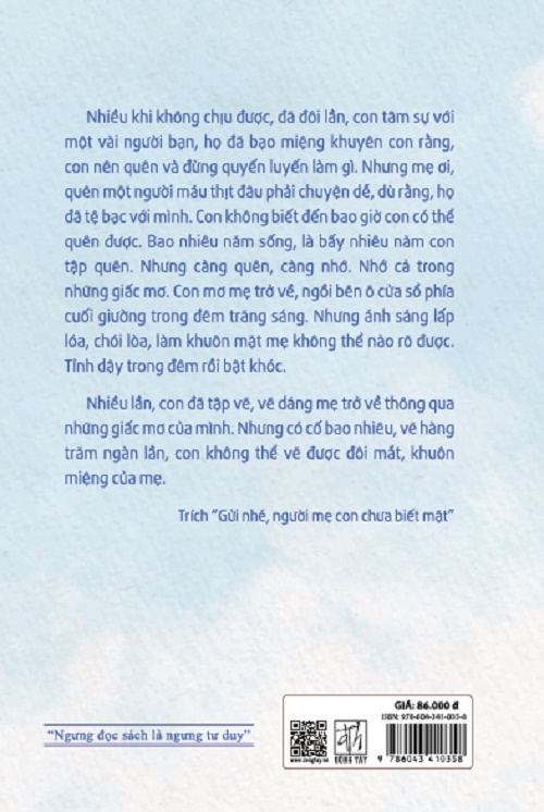 "Nhiều khi không chịu được, đã đôi lần, con tâm sự với một vài người bạn, họ đã bạo miệng khuyên con rằng, con nên quên và đừng quyến luyến làm gì. Nhưng mẹ ơi, quên một người máu thịt đâu phải là chuyện dễ, dù rằng, họ đã tệ bạc với mình. Con không biết đến bao giờ con có thể quên được. Bao nhiêu năm sống, là bấy nhiêu năm con tập quên. Nhưng càng quên, càng nhớ. Nhớ cả trong những giấc mơ. Con mơ mẹ trở về, ngồi bên ô cửa sổ phía cuối giường trong đêm trăng sáng. Nhưng ánh sáng lấp lói, chói lòa, làm khuôn mặt mẹ không thể nào rõ được. Tỉnh dậy trong đêm rồi bật khóc. Nhiều lần, con đã tập vẽ, vẽ dáng mẹ trở về thông qua những giấc mơ của mình. Nhưng có cố bao nhiêu, vẽ hàng trăm ngàn lần, con không thể vẽ được đoi mắt, khuôn miệng của mẹ." Trích "Gửi nhé, người mẹ con chưa biết mặt"
