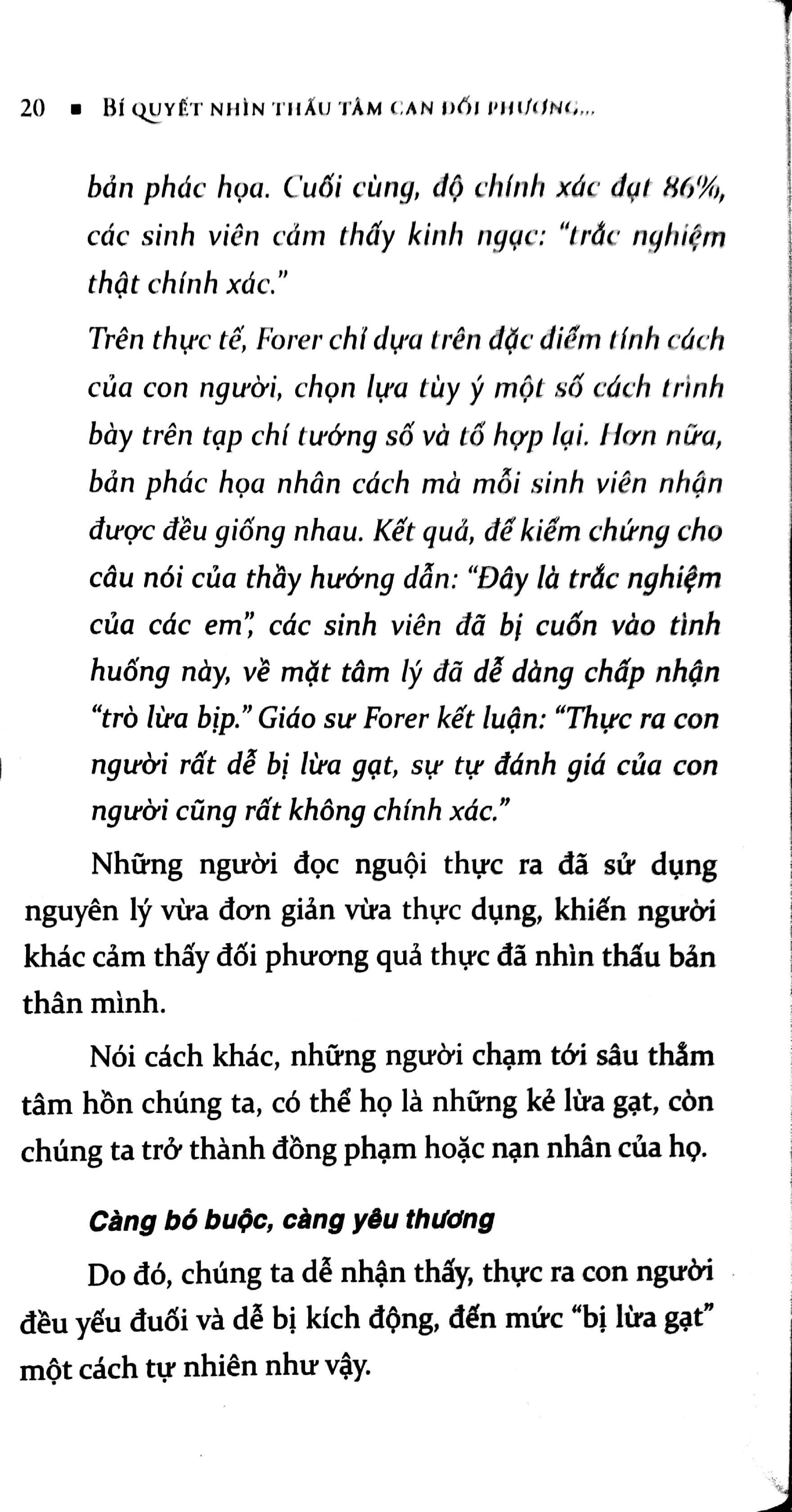 Thuật Đọc Nguội Làm thế nào để có thể áp dụng hiệu quả tâm lý học vào quan hệ giao tiếp? Nhà giáo Hiroyuki Ishii (Nhật Bản) đã phát triển một kỹ năng giao tiếp mang tính thực tế cao – thuật đọc nguội. Trong tình huống không có sự chuẩn bị trước, kỹ năng này dùng để nắm bắt tâm lý của đối phương và dự báo sự việc sẽ diễn ra trong tương lai, nhờ đó có thể nhanh chóng được đối phương tin tưởng. Trên các trang mạng và diễn đạt, người ta thảo luận sôi nổi về kỹ năng này. Kết quả thử nghiệm của một nhóm nghiên cứu phát triển kỹ năng thuật đọc nguội đã khiến nhiều người cảm thấy rất thú vị và hào hứng. Mặc dù vậy, mức độ phổ cập và phạm vi ứng dụng kỹ năng này trong xã hội còn rất hạn hẹp và khá xa lạ với số đông những người yêu thích tâm lý học, những người gặp khó khăn về giao tiếp xã hội, chưa nói đến chuyện ứng dụng thành thục. Trong các kỹ năng giao tiếp của con người, thuật đọc nguội chỉ là một cách gọi, còn bản chất của nó vẫn là ứng dụng những kiến thức tâm lý học như: đọc hiểu nội tâm, cảm ứng, thôi miên… Với mục đích học để ứng dụng, dựa trên những kết quả nghiên cứu ứng dụng tâm lý học trong một thời gian dài, tác giả trình bày và giải thích về thuật đọc nguội một cách hệ thống. Sau khi tổng hợp tối đa các kiến thức chuyên ngành như: tâm lý học, ngôn ngữ học, marketing… tác giả đã chỉnh lý, bổ sung và kết cấu thành hệ thống về kỹ năng này từ những ứng dụng của nó trong cuộc sống hàng ngày như: làm sao để nhanh chóng có được sự tin tưởng của đối phương, hay làm thế nào để khởi đầu giao tiếp một cách thuận lợi, tìm hiểu và nắm bắt tâm lý của người hướng nội hay hướng ngoại… Trong chương cuối cùng của cuốn sách, tác giả tuyển chọn ra chin loại hình ngôn ngữ đọc nguội quan trọng nhất trong giao tiếp xã hội. Khi đã nắm vững kỹ năng, vận dụng thành thục thuật đọc nguội để hiểu thấu và điều khiển suy nghĩ của đối phương, bạn sẽ chiếm được cảm tình của rất nhiều người, các mối quan hệ xã hội của bạn cũng từ đó sẽ ngày càng được mở rộng. Trong cuộc sống hằng ngày, việc xử lý các vấn đề như: quan hệ với khách hàng, ứng xử với sếp và nhân viên, làm thế nào để xây dựng mối quan hệ thân thiết với người khác giới, làm thế nào để phát triển nhiều hơn nữa các mối quan hệ xã hội… khiến chúng ta đau đầu. Mục đích duy nhất của cuốn sách này là giúp bạn giải quyết những vấn đề kể trên: hướng dẫn bạn cách chung sống hòa thuận với mọi người trong công việc, đời sống. Qua việc đọc cuốn sách này, bạn sẽ dễ dàng nắm vững và vận dụng kỹ năng giao tiếp xã hội, giúp bạn phát huy sức hấp dẫn, được chào đón mọi lúc mọi nơi, dễ dàng chiếm được cảm tình và niềm tin của mọi người .