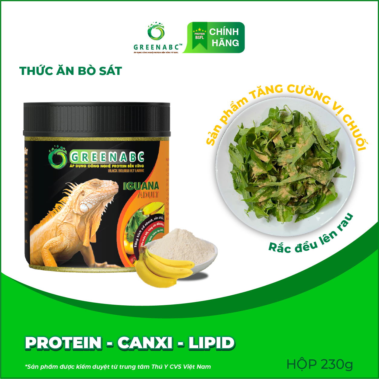 GREENABC - THỨC ĂN IGUANA TRƯỞNG THÀNH VỊ CHUÔI- Rồng Nam Mỹ trưởng thành từ 1m trở lên GREENABC là thức ăn cao cấp dành cho Iguana Trưởng Thành - Rồng Nam Mỹ Trưởng Thành. Đặc biệt sản phẩm GREENABC được sản xuất theo phương pháp Áp dụng công nghệ PROTEIN bền vững từ bột đạm G.Meal rất giàu PROTEIN – CANXI – LIPID có trong BSFL, đã được Mỹ (AAFCO) và EU chấp nhận đưa vào công thức cho ngành sản xuất thức ăn dành cho vật nuôi. Sản phẩm GREENABC cung cấp các giá trị dinh dưỡng bền vững cho Iguana với sự kết hợp 90% thành phần có nguồn gốc thực vật và 10% thành phần có nguồn gốc động vật từ côn trùng, giúp cho Iguana: