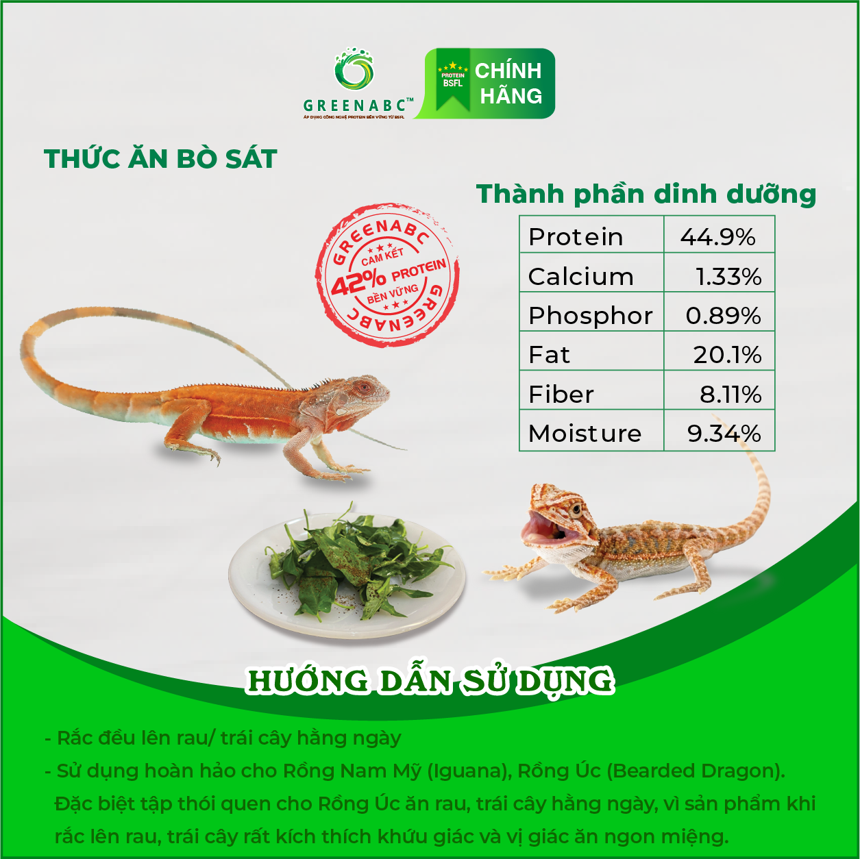 GREENABC là thức ăn cao cấp dành cho các loại bò sát: IGUANA, BEARDED DRAGON, LEOPARD GECKO. Đặc biệt sản phẩm GREENABC được sản xuất theo phương pháp Áp dụng công nghệ PROTEIN BỀN VỮNG từ bột đạm G.Meal rất giàu PROTEIN–CANXI–LIPID có trong BSFL*, đã được Mỹ (AAFCO) và EU chấp nhận đưa vào công thức cho ngành sản xuất thức ăn dành cho thú cưng.