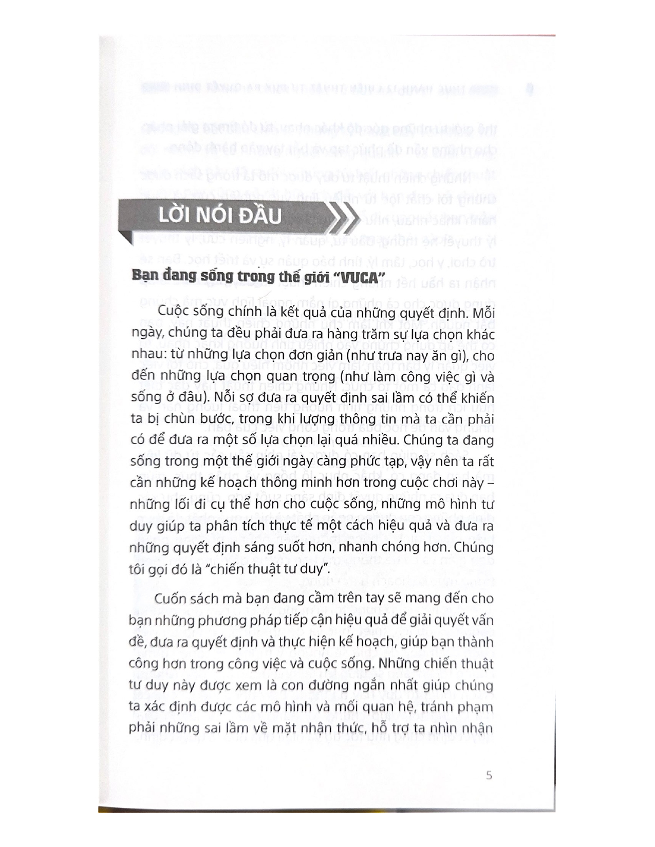 - Giới thiệu Thực Hành 12 Chiến Thuật Tư Duy Ra Quyết Định Cuộc sống chính là kết quả của những quyết định. Mỗi ngày, chúng ta đều phải đưa ra hàng trăm sự lựa chọn khác nhau: từ những lựa chọn đơn giản (như trưa nay ăn gì), cho đến những lựa chọn quan trọng (như làm công việc gì và sống ở đâu). Chúng ta đang sống trong một thế giới ngày càng phức tạp, vậy nên rất cần những mô hình tư duy giúp ta phân tích thực tế một cách hiệu quả và đưa ra những quyết định sáng suốt hơn, nhanh chóng hơn. Cuốn sách mà bạn đang cầm trên tay sẽ mang đến nhiều ví dụ, công cụ và chiến thuật hữu ích để bạn nâng cao chất lượng, tốc độ và hiệu quả đưa ra quyết định. Khi làm chủ được những chiến thuật trong sách, bạn sẽ dễ dàng vượt qua các tình huống tiến thoái lưỡng nan và những vấn đề hóc búa, từ đó thành công hơn trong cả công việc lẫn cuộc sống.