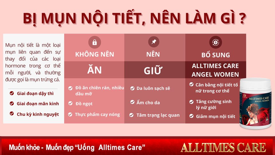 - Xuất xứ: Australia (Úc) Mất cân bằng nội tiết tố nữ là tình trạng lượng hormone trong cơ thể quá nhiều hoặc quá ít. Điều này ảnh hưởng trực tiếp đến sắc đẹp, đời sống chăn gối và sức khỏe sinh sản của chị em. Viên uống Alltimes Care Angel Women là điều cần thiết ngay lúc này để trả lại niềm vui, duy trì sức khỏe sắc đẹp và sinh lý cho phái nữ. Viên uống Alltimes Care Angel Women được bào chế dưới dạng viên dễ uống chiết xuất từ các thành phần thảo dược hỗ trợ cân bằng nội tiết nữ và sự góp mặt của thành phần đặc biệt là Collagen thủy phân - Collagen từ cá biển. Hiện nay, loại collagen làm từ cá biển được xem là “siêu phẩm” chăm sóc sức khỏe, sắc đẹp của nhiều chị em. Collagen này có cấu trúc collagen khá giống với cơ thể người, thuộc dạng collagen thủy phân cho hiệu quả cao gấp 07 lần nên rút ngắn được thời gian hấp thu so với loại collagen thông thường.