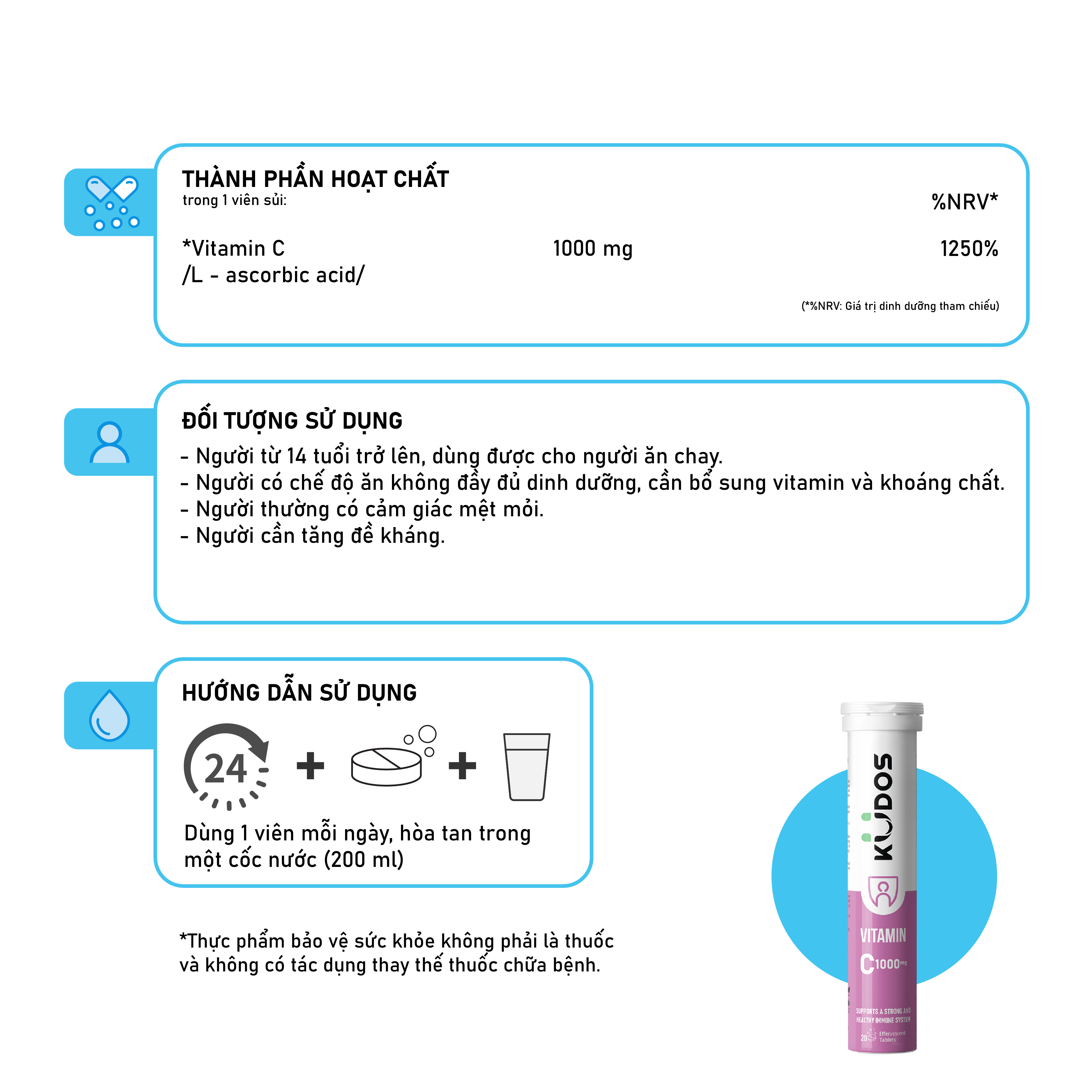 KUDOS VITAMIN C 1000MG HỖ TRỢ TĂNG SỨC ĐỀ KHÁNG HƯƠNG CHANH TUÝP 20 VIÊN SỦI THÔNG TIN SẢN PHẨM: • Đơn vị tính và Quy cách đóng gói: Một Tuýp - 20 viên •