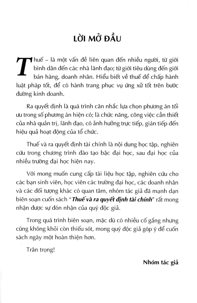 Mua tại TiktokThuế Và Ra Quyết Định Tài Chính Thuế – là một vấn đề liên quan đến nhiều người, từ giới bình dân đến các nhà lãnh đạo; từ giới tiêu dùng đến giới bán hàng, doanh nhân. Hiểu biết về thuế để chấp hành luật pháp tốt, để có hành trang phục vụ ứng xử tốt trên bước đường kinh doanh. Ra quyết định là quá trình cân nhắc lựa chọn phương án tối ưu trong số phương án hiện có; là chức năng, công việc cần thiết của nhà quản trị, lãnh đạo, có ảnh hưởng trực tiếp, gián tiếp đến hiệu quả hoạt động của tổ chức. Thuế và ra quyết định tài chính là nội dung học tập, nghiên cứu trong chương trình đào tạo bậc đại học, sau đại học của nhiều trường đại học hiện nay. Thuế Và Ra Quyết Định Tài Chính là nội dung học tập, nghiên cứu trong chương trình đào tạo bậc đại học, sau đại học của nhiều trường đại học hiện nay.