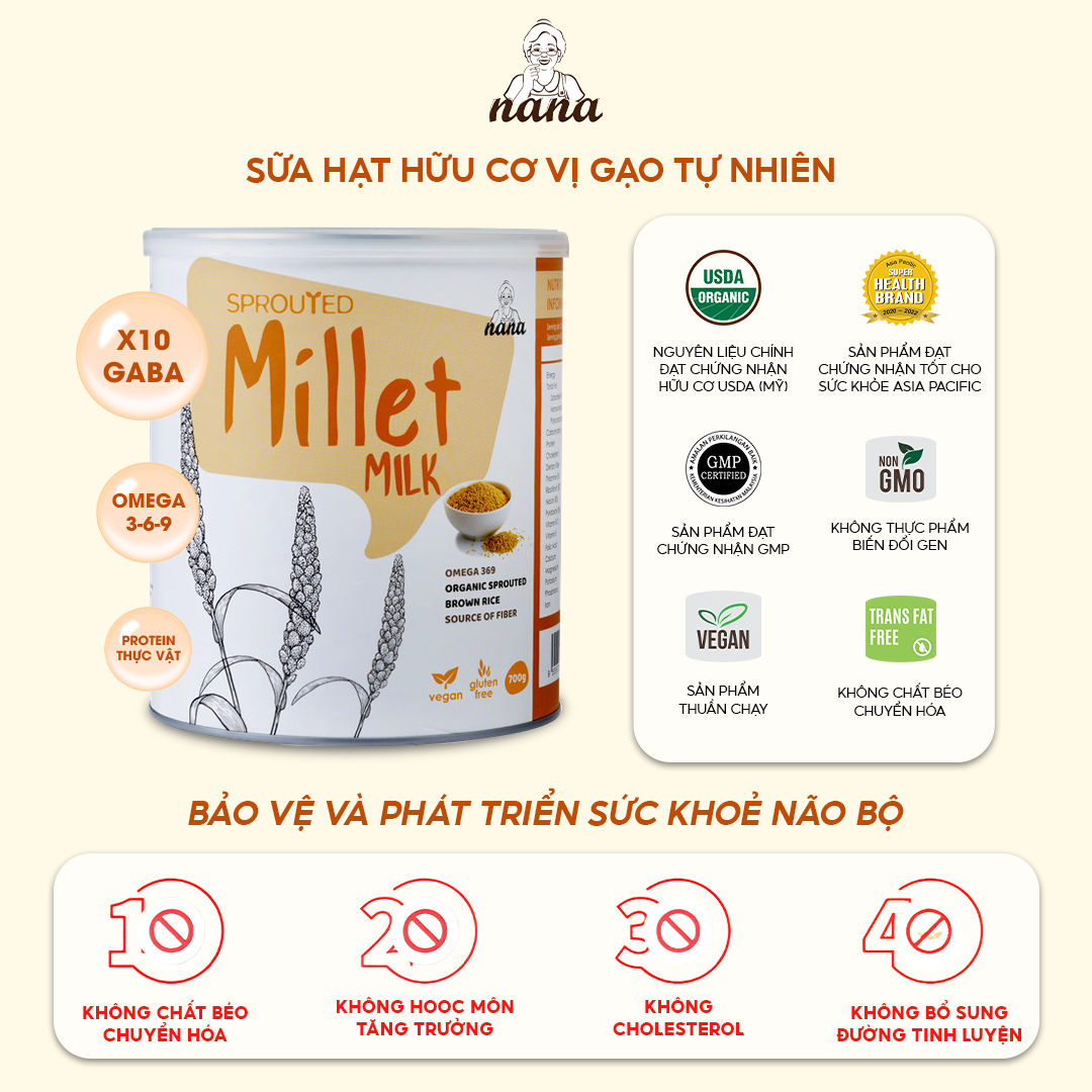 - GABA trong sữa Millet là chất dẫn truyền thần kinh vốn có trong não bộ, được chiết suất hoàn toàn từ gạo lứt hữu cơ nảy mầm, ở dạng đã hoạt hóa dễ dàng hấp thu nhất cho cơ thể và não bộ.
