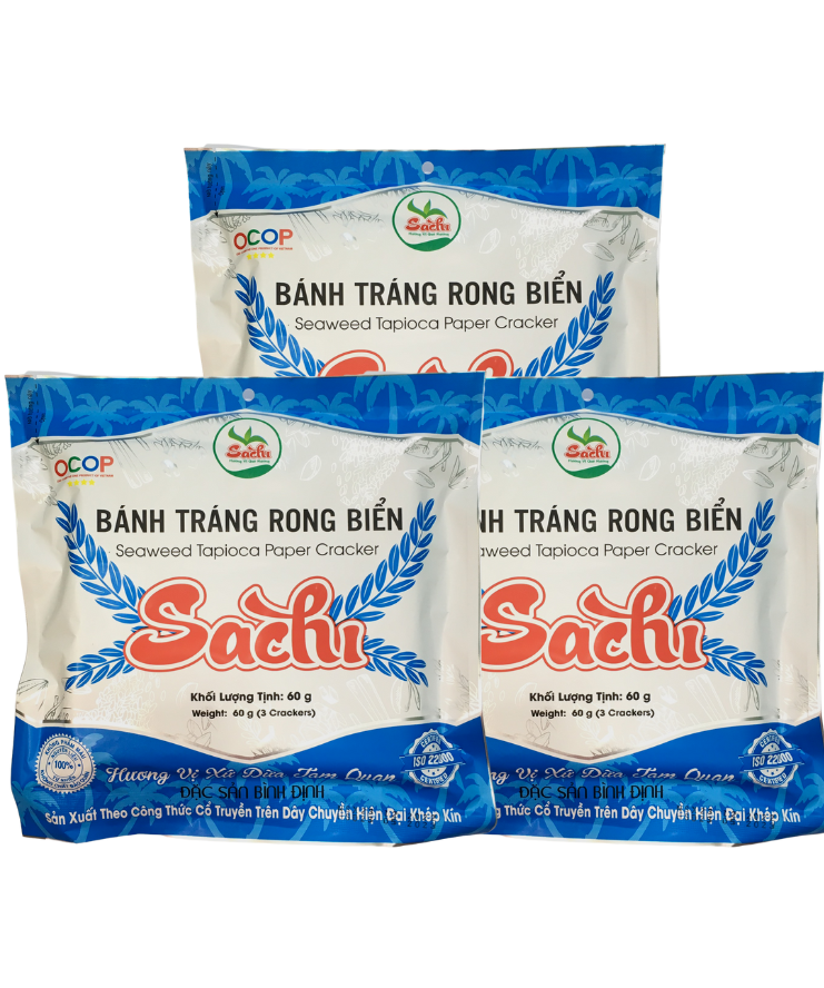 Bánh tráng gạo mỏng Sachi là món ăn không thể thiếu của người dân Bình Định, trong các dịp lễ cũng như các bửa ăn ngày thường. Thành phần: Gạo 93%, tinh bột mì, muối.
