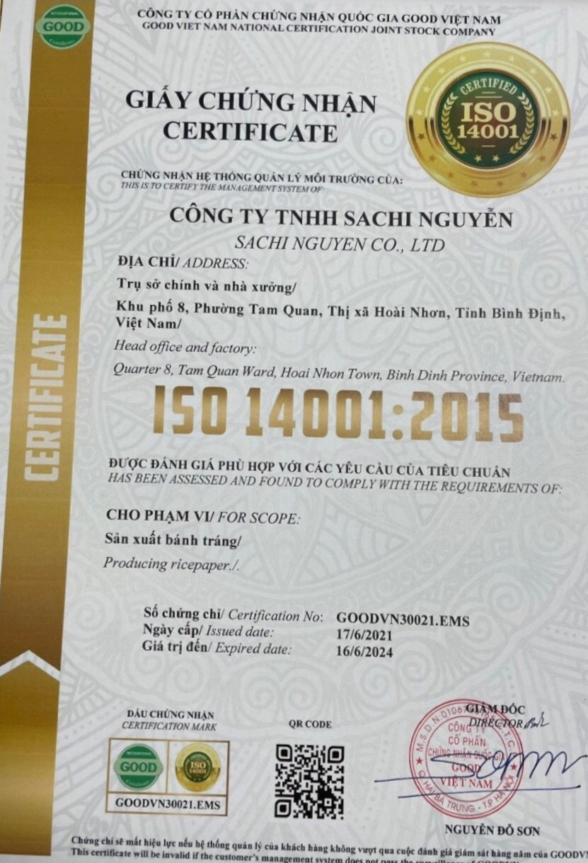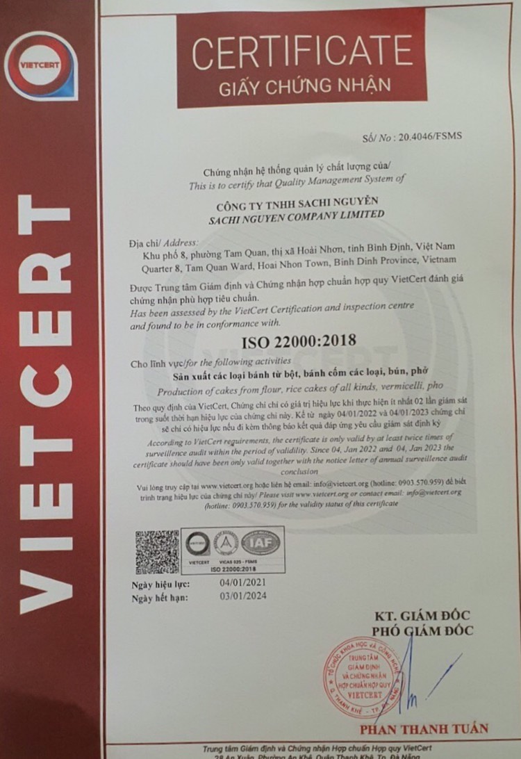Các chứng nhận: Đạt chứng nhận ISO 22000: 2018 Đạt chứng nhận ISO 14001: 2015 Đạt chứng nhận Sản Phẩm Công Nghiệp Nông Thôn Tiêu Biểu Đạt chứng nhận Sản Phẩm OCOP 4 sao Xuất khẩu đến thị trường Mỹ, Canada, Đài Loan,