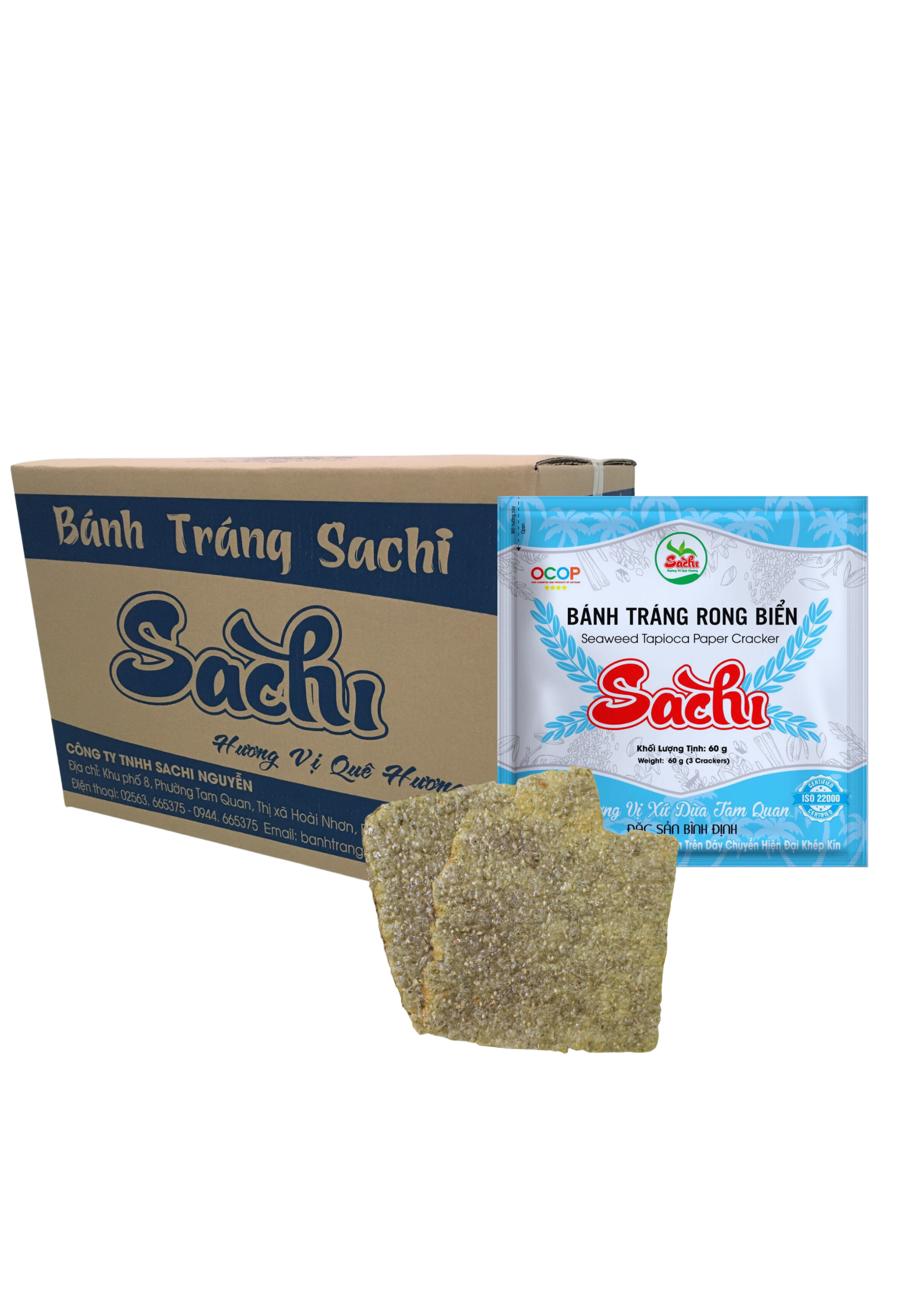 Bánh tráng nước dừa nướng sẵn Sachi xốp, giòn rụm, rong biển, được sản xuất trên dây chuyền hiện đại khép kín, bánh nướng bằng điện vàng đều 2 mặt, bao bì hút chân không