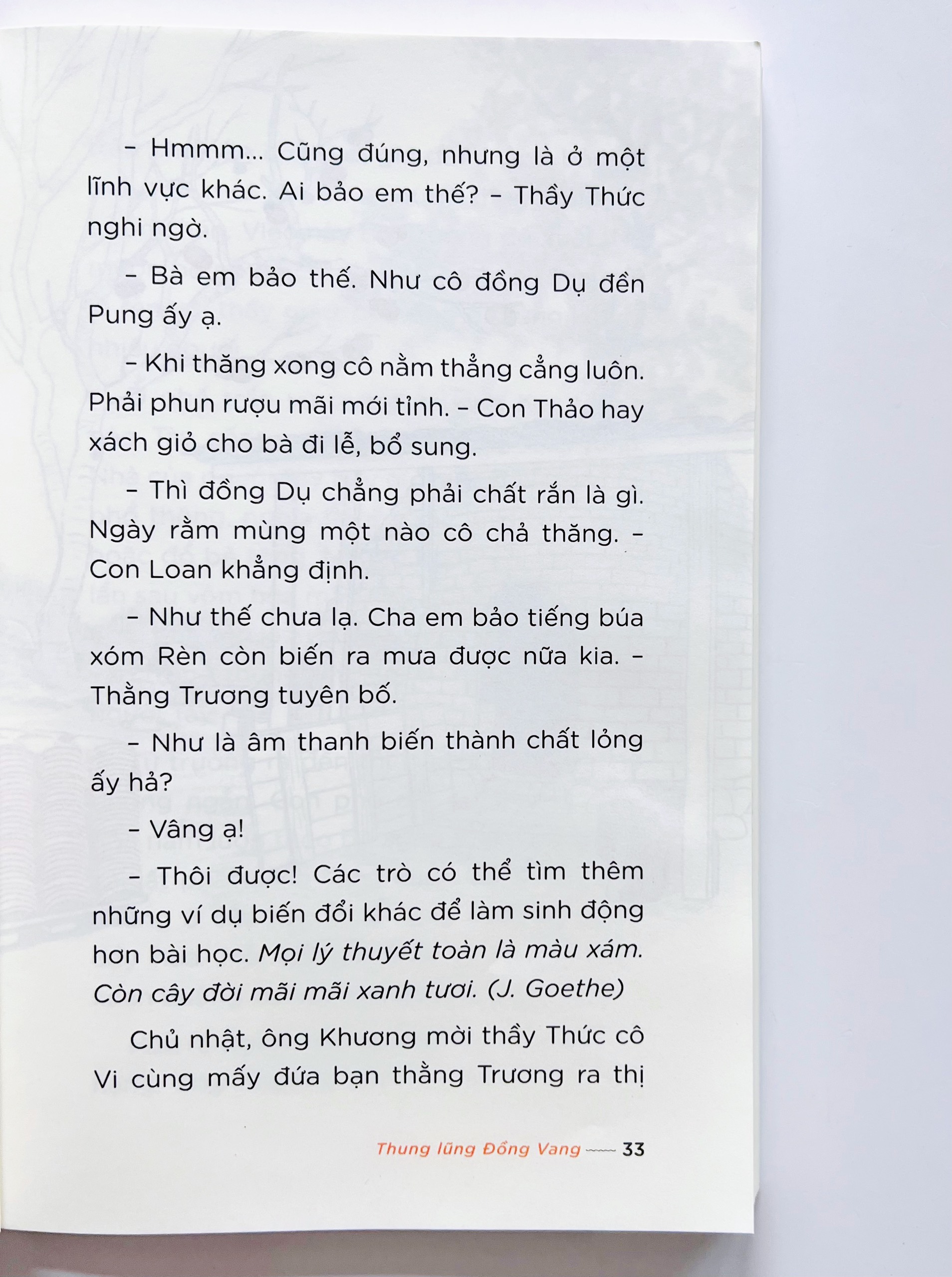 Ở Thung lũng Đồng Vang còn có tình bạn đẹp đẽ, còn có những giá trị văn hóa độc đáo, nơi đây có người Tày và người Kinh sống chung, Vùng yên bình này có ngôi trường cạnh bên dòng sông, có ruộng bậc thang, có núi đồi, thôn bản và thời tiết thay đổi theo từng mùa. Hiển nhiên, Thung lũng Đồng Vang còn có những câu chuyện chưa được kể, hoặc kể dở dang như bức thư mà ông Kiền – người ông từng tham gia chiến trường K – viết cho Thụy và Thảo. Như chuyện những chuyến xe đường dài của bố mẹ Thụy – Thảo đi dọc dài đất nước. Nhưng người đọc hẳn sẽ đầy bất ngờ với nhiều chuyện kỳ thú khác, như chuyện xóm rèn gõ búa ra mưa, chuyện đốt lửa dưới gốc trám để quả trám chín tự rụng xuống, những sinh hoạt thường ngày đầy khí chất miền cao, những buổi dã ngoại của lớp học, thầy trò Đồng Vang đã biến kiến thức thành những bài học thực tế thú vị, vui nhộ được viết với ngôn ngữ đặc tải hình ảnh vô cùng đặc trưng, chi tiết.