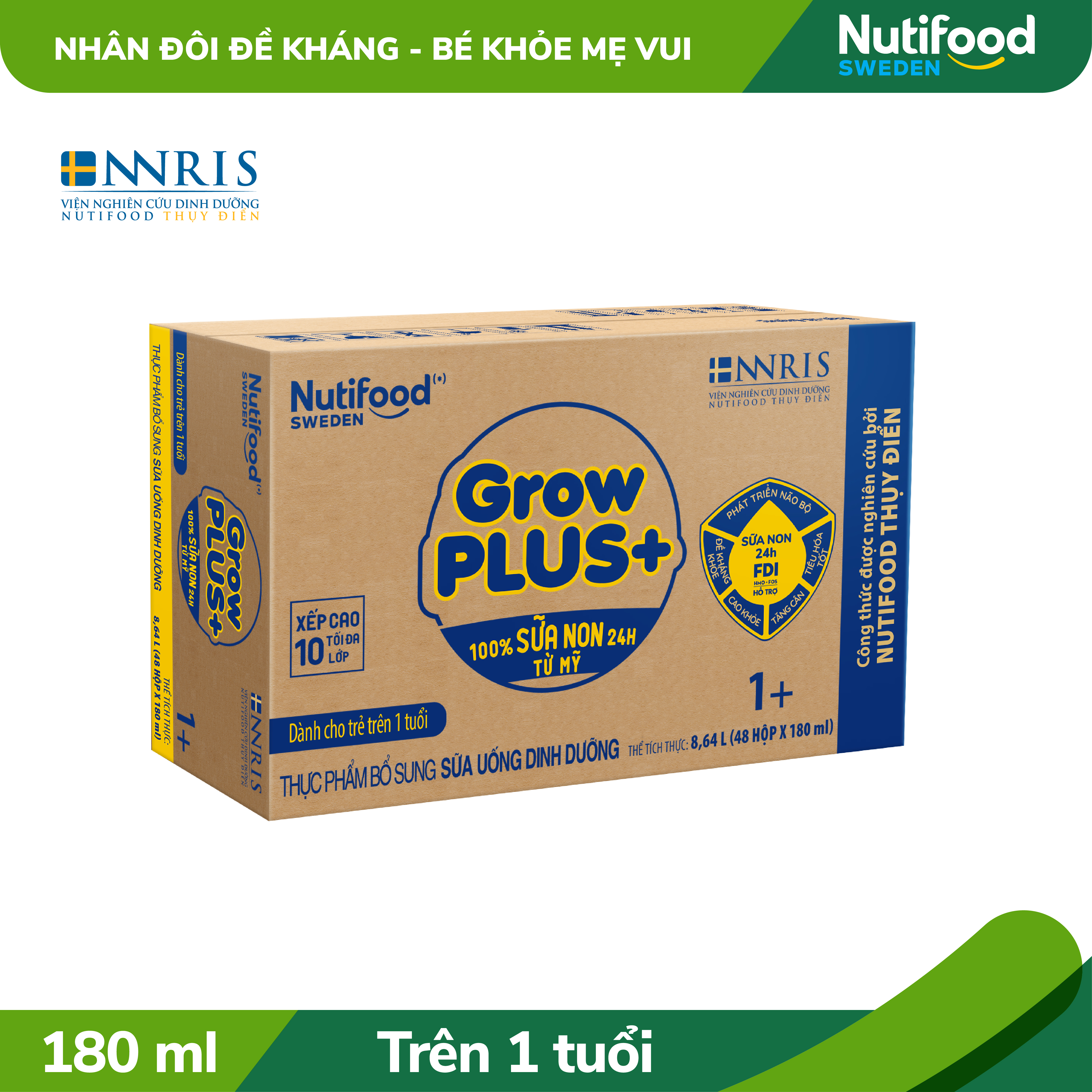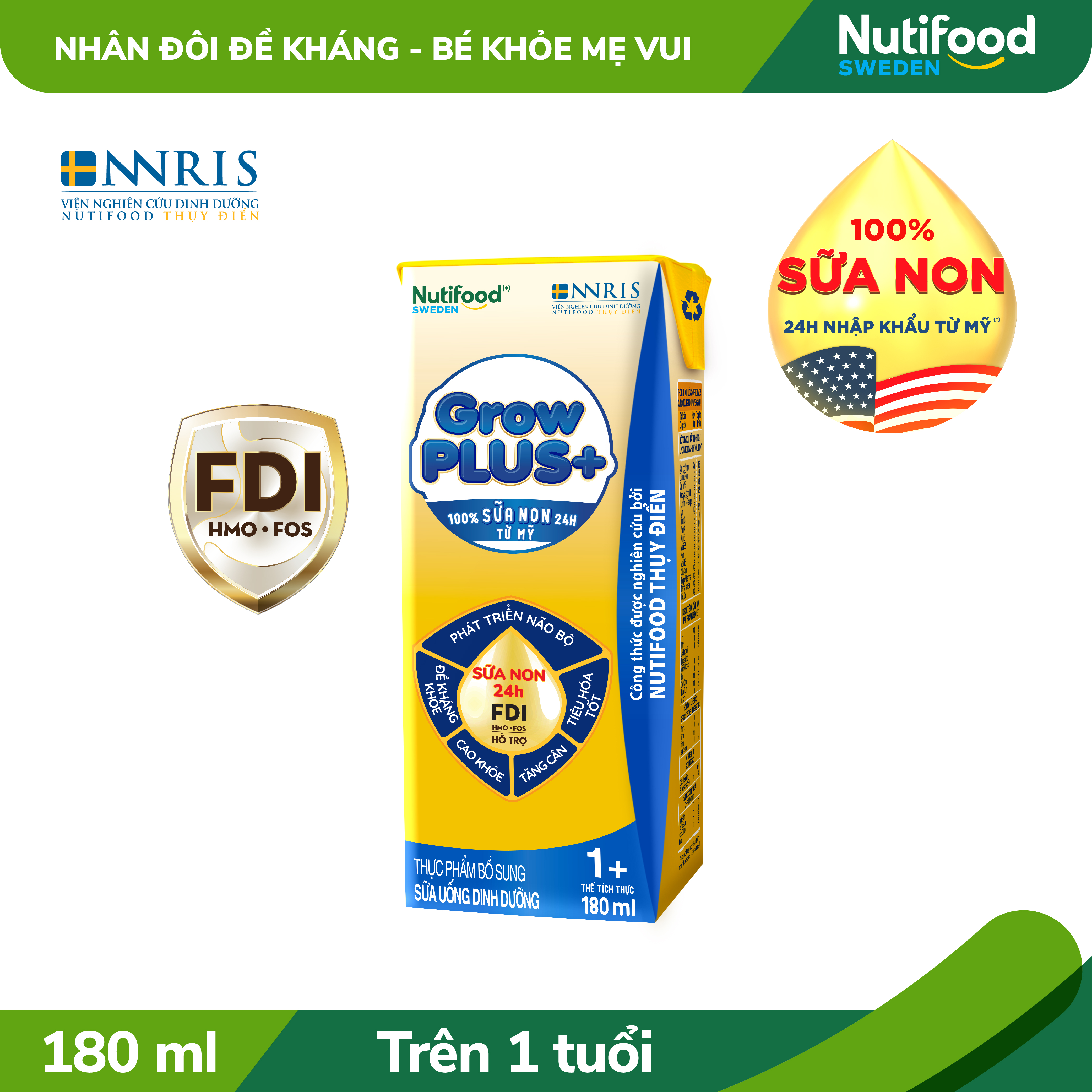 Nutifood Sweden GrowPLUS+ chứa Sữa non 24 giờ có công thức được phát triển bởi Viện nghiên cứu dinh dưỡng Nutifood Thụy Điển (NNRIS), xây dựng nền tảng FDI Đề kháng khỏe, tiêu hóa tốt