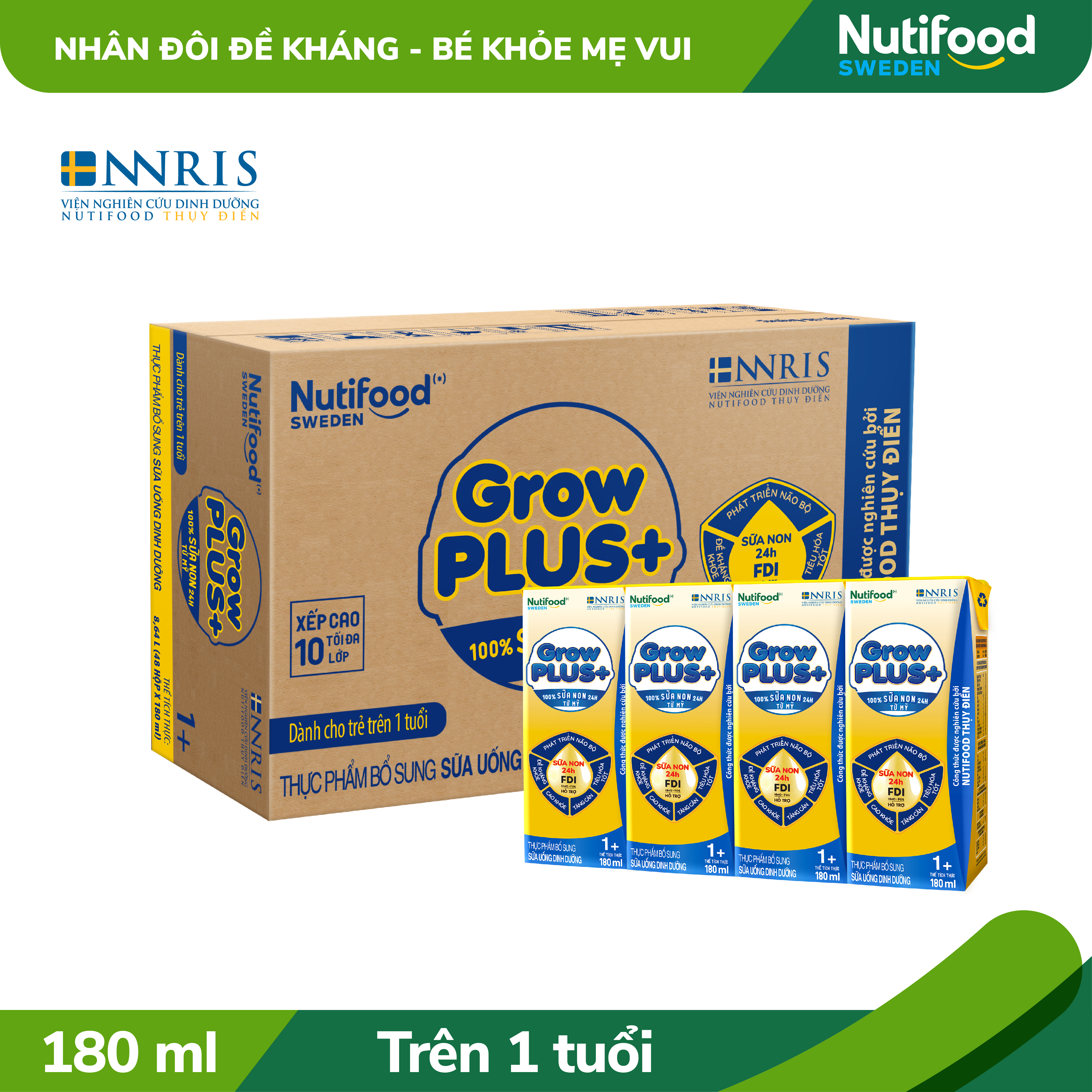 Nutifood Sweden GrowPLUS+ chứa Sữa non 24 giờ có công thức được phát triển bởi Viện nghiên cứu dinh dưỡng Nutifood Thụy Điển (NNRIS), xây dựng nền tảng FDI Đề kháng khỏe, tiêu hóa tốt giúp trẻ hấp thu các dưỡng chất. Nay bổ sung 100% Sữa non 24h tự nhiên từ Mỹ cùng 2'-FL HMO giúp tăng cường đề kháng, tạo nền tảng vững chắc cho bé cao lớn và phát triển não bộ.  THÀNH PHẦN (INGREDIENTS): Nước, sữa bột (9 %), đường, chất béo sữa, maltodextrin, chất béo thực vật, chất xơ thực phẩm (FOS (0,27 %), Inulin), chất ổn định (466, 460(i), 407, 471), sữa non (1000 mg/L), hỗn hợp vitamin và khoáng chất (A, D3, C, E, K1, B1, B3, B5, B6, B12, acid folic, kẽm oxyd, biotin, kali iodid, inositol), hương liệu tổng hợp, cholin, DHA từ dầu cá, 2'-Fucosyllactose (2'-FL), taurin, lutein. Có chứa sữa, đậu nành, dầu cá. Không sử dụng chất bảo quản.  LỢI ÍCH SẢN PHẨM: