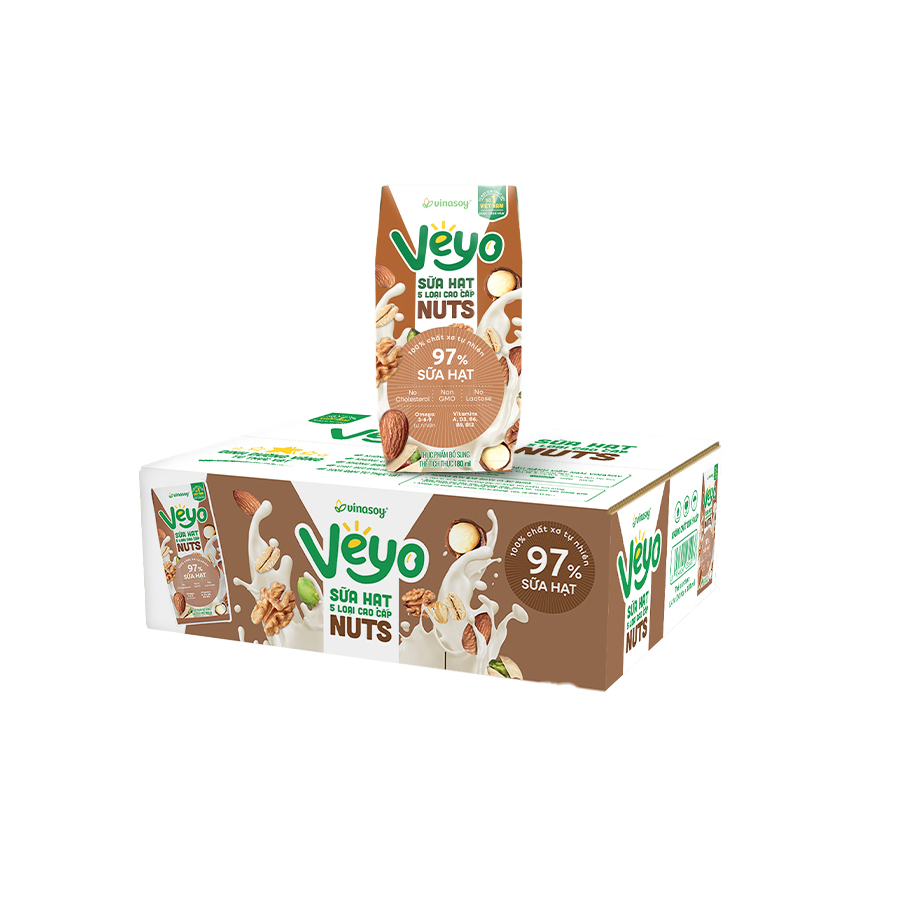 - VEYO SỮA HẠT 5 LOẠI CAO CẤP nguồn dinh dưỡng trọn vẹn từ ÓC CHÓ, HẠNH NHÂN, MẮC CA, YẾN MẠCH, DẺ CƯỜI mang đến vị ngọt dịu nhẹ, bùi béo tự nhiên, hòa