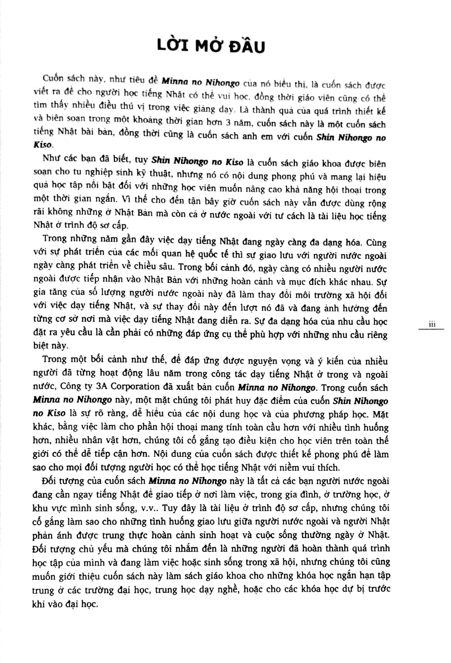 “Minna no Nihongo” là bộ giáo trình sơ cấp dành cho những ai muốn tìm hiểu về tiếng Nhật rất thông dụng tại Châu Á và Việt Nam. Sách gồm 2 tập với 50 bài học, mỗi bài bao gồm phần Mẫu câu, Ví dụ, Hội thoại, Luyện tập và các câu hỏi đặt ra để trả lời. Bộ giáo trình này phù hợp với nhiều đối tượng: từ học sinh, sinh viên, và cả những ai muốn nắm chắc kiến thức cơ bản về tiếng Nhật để học tập và làm việc trong môi trường sử dụng tiếng Nhật.