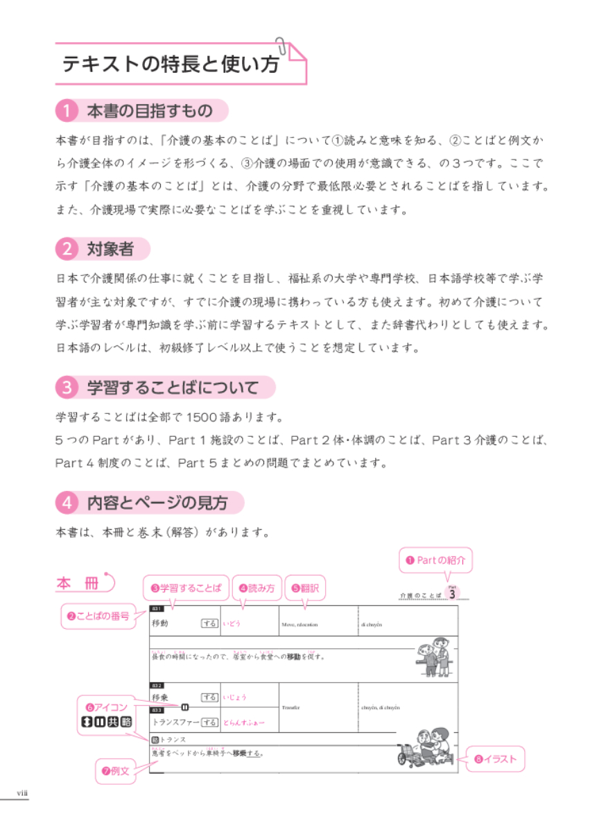 Nằm trong bộ sách Tiếng Nhật chuyên ngành điều dưỡng. Quyển "Từ vựng cơ bản" này là tổng hợp các từ vựng chuyên ngành điều dưỡng, kèm bản dịch Anh Việt và các câu ví dụ bám sát hiện trường làm việc thực tế. Giúp người học có cái nhìn tổng quát về ngành điều dưỡng. Có đính kèm tấm nhựa đỏ phục vụ việc tự học. Đây là giáo trình rất bổ ích cho những người đang học ngành điều dưỡng, hoặc muốn làm việc trong ngành điều dưỡng tại Nhật Bản .