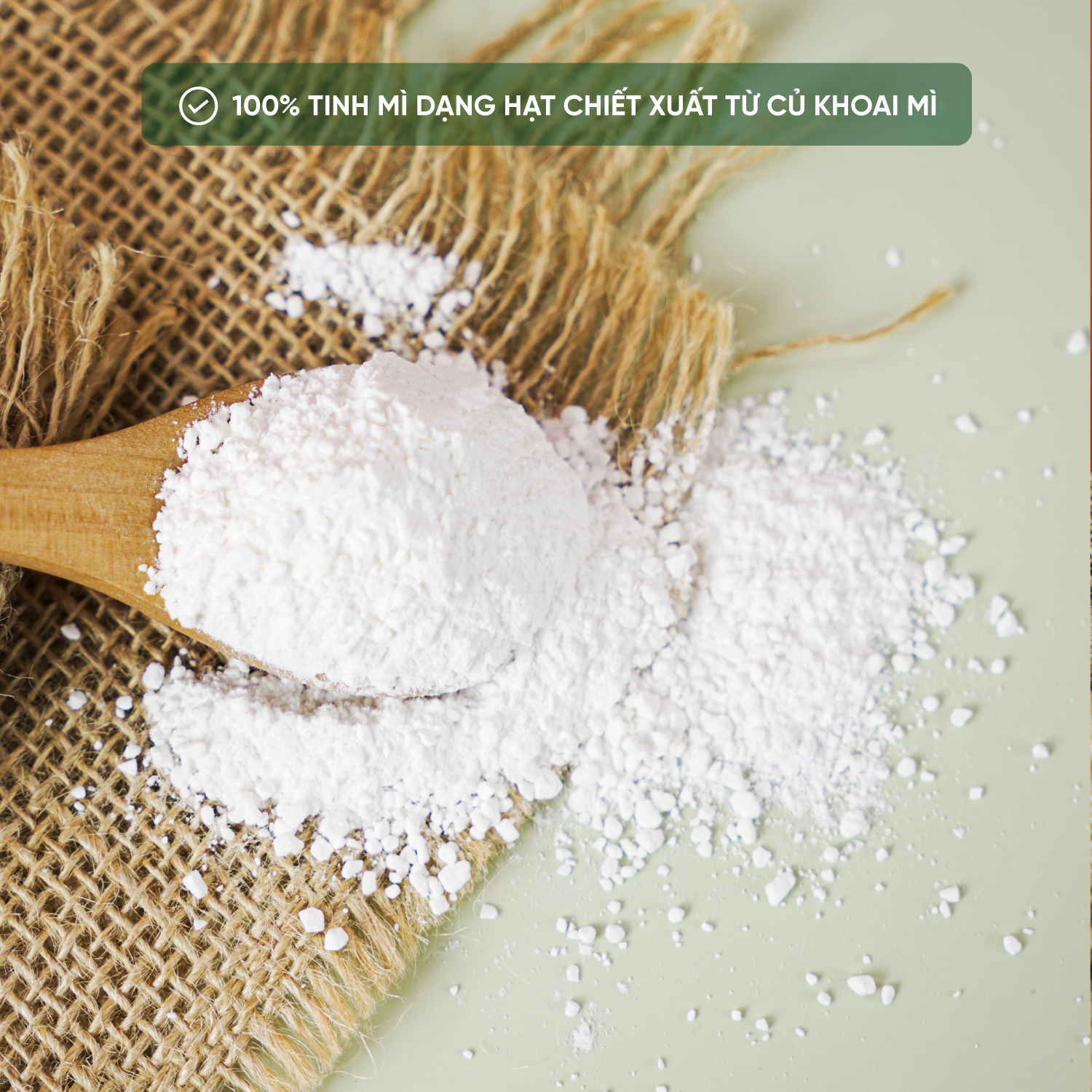 - Thành phần: 100% Nguyên chất từ củ khoai mì chiết xuất thành tinh bột dạng hạt. Không chất bảo quản, không phụ gia.