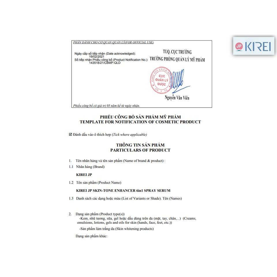 Combo tiện và tiết kiệm gồm: * 01 Tinh Chất Cấp Ẩm - Dưỡng Trắng Dạng Xịt 6 trong 1 Kirei JP - 6in1 Spray Serum 100ml. * 01 Tinh Chất Dưỡng Trắng Dạng Xịt