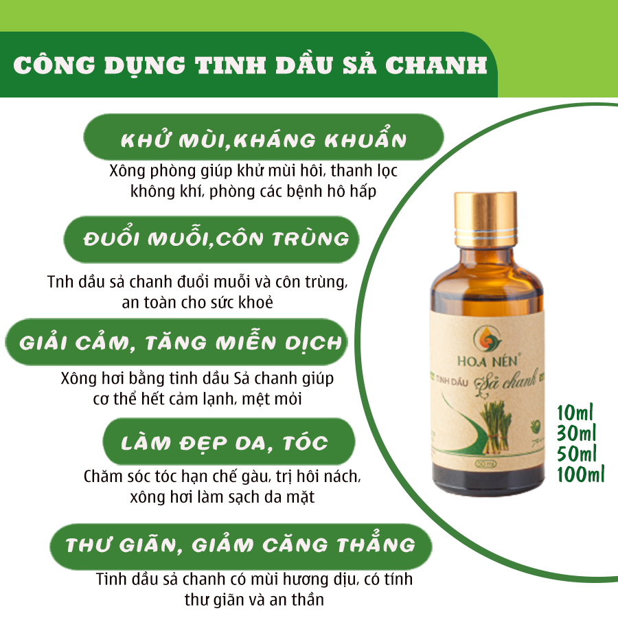 Tinh dầu sả chanh được chiết xuất từ 100% cây sả chanh tươi (cây sả làm gia vị) chứa chủ yếu là citral (65-85%), geraniol (40%). CÔNG DỤNG: CÁCH SỬ DỤNG: Xông, hít hoặc massage qua da (pha với dầu nền hoặc dùng lượng nhỏ); nhỏ vào bồn tắm; xông bằng đèn xông tinh dầu, máy khuếch tán. Thận trọng: Không để tinh dầu tiếp xúc trực tiếp với mắt và vùng da nhạy cảm vì tinh dầu sả chanh có độ nóng. KINH NGHIỆM THƯỜNG DÙNG: