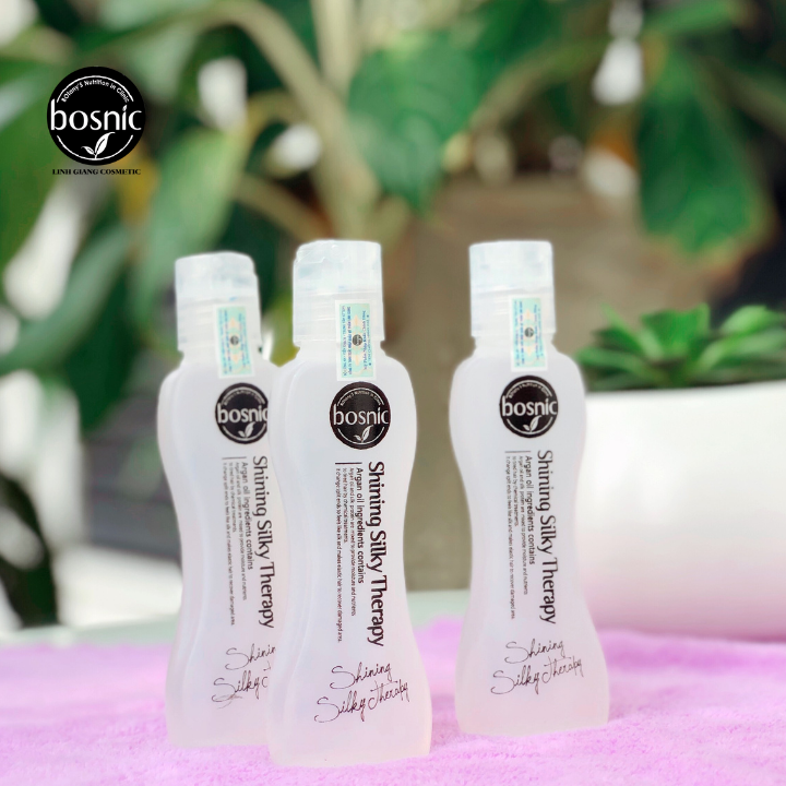 Tinh Dầu Siêu Mượt Bosnic - Shining Silky Therapy 60ml là lựa chọn hàng dầu trong sản phẩm dưỡng tóc. Với tinh chất từ quả Argan giúp cho tóc sau khi sử dụng sản phẩm luôn óng mượt, giảm gãy rụng,chẻ ngọn, khô xơ và vô số các vấn đề về tóc đều sẽ được giải quyết chỉ với 1 chai tinh dầu Silky. Đối với những khách hàng thường xuyên sử dụng các loại máy nhiệt để tạo kiểu tóc (uốn, duỗi,bấm tóc, v..v) hoặc đã từng sử dụng qua hóa chất làm tóc thì tóc sẽ dần mất đi độ cân bằng, suôn mượt và chắc khỏe vốn có, chính vì thế, việc sử dụng tinh dầu siêu mượt Shining Silky Therapy trước khi sử dụng hóa chất làm tóc sẽ giúp giảm thiểu hư tổn cho tóc, cân bằng lại độ ẩm và giúp tóc luôn chắc khỏe, bóng mượt.