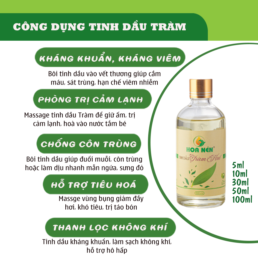 Mua tại TiktokTinh dầu Tràm Huế nguyên chất Hoa Nén 50ml Sản phẩm Tinh dầu tràm của Công ty TNHH MTV Sản xuất Tinh dầu HOA NÉN, được chiết xuất từ 100% cây tràm gió thiên nhiên. Theo quy định của Dược điển Việt Nam III, hàm lượng Cineol trong dầu đạt 40%- 60% là Dầu Tràm; >60% là đạt tinh dầu tràm. TINH DẦU TRÀM HOA NÉN với hàm lượng cineol chiếm 67,5% (theo Dược điển Việt Nam III), đã được Sở Y tế Thừa Thiên Huế kiểm định chất lượng và đã được Chi cục đo lường chất lượng xác nhận công bố chất lượng sản phẩm. Thành phần