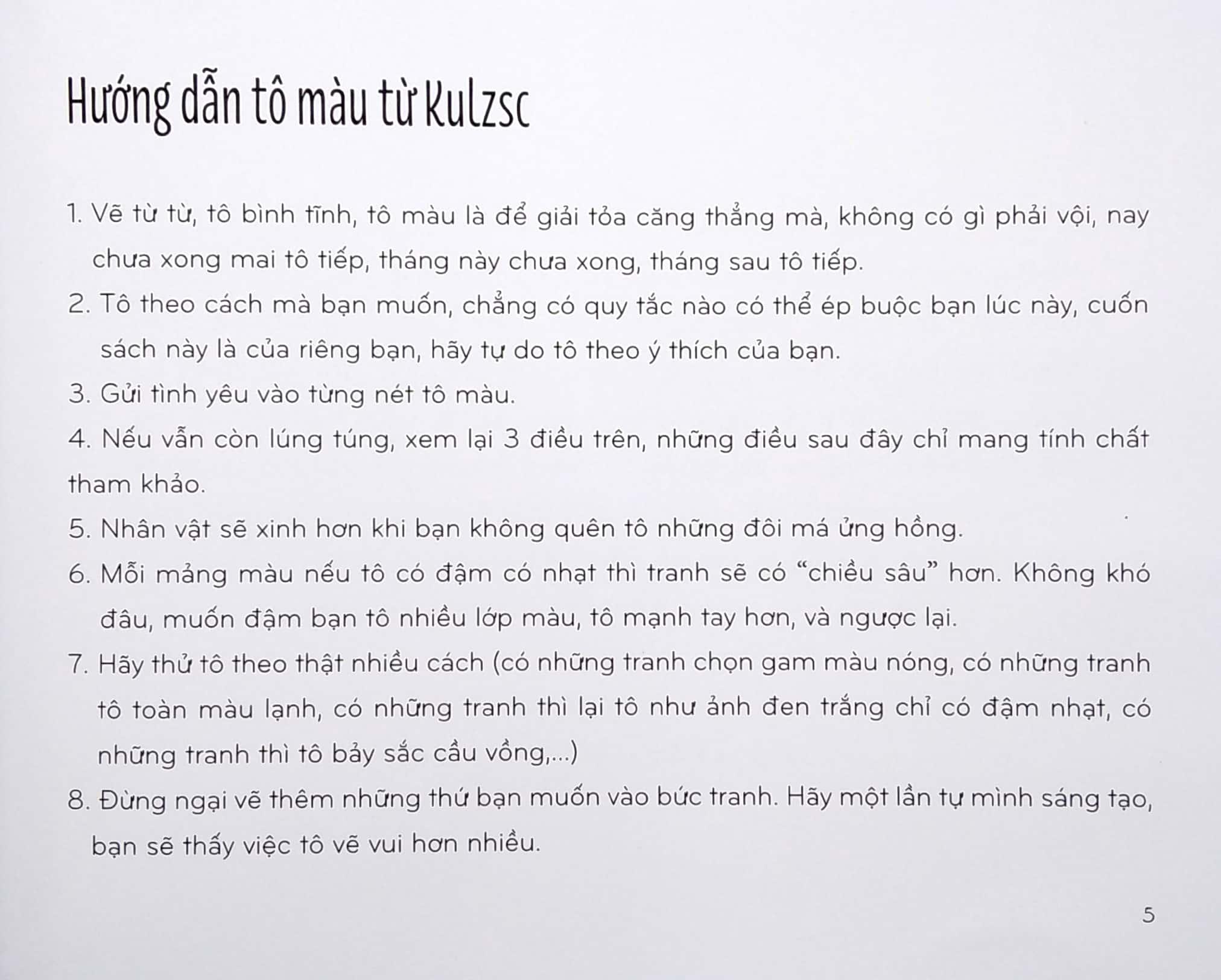 Bởi tô màu là một hình thức chữa lành đơn giản mà hiệu quả, nên mỗi khi thấy bực dọc, chán nản, hay khiến mình bận rộn hơn hãy thử tìm tới “Tô bình yên - vẽ hạnh phúc” cùng hộp màu đã cất lâu trong tủ và Sao không thể là một đám mây màu tím, một mái tóc vàng tươi hay một nụ hoa màu xanh biển nhỉ? Không cần phải đắn đo đâu, bạn cứ thoải mái xóa đi căng thẳng, xóa đi những gam màu u ám, tự tay mình điểm tô những màu sắc tươi sáng lấp lánh, đầy ắp hy vọng theo ý thích, tận hưởng những phút thư giãn thật bình yên không muộn phiền thôi nào.