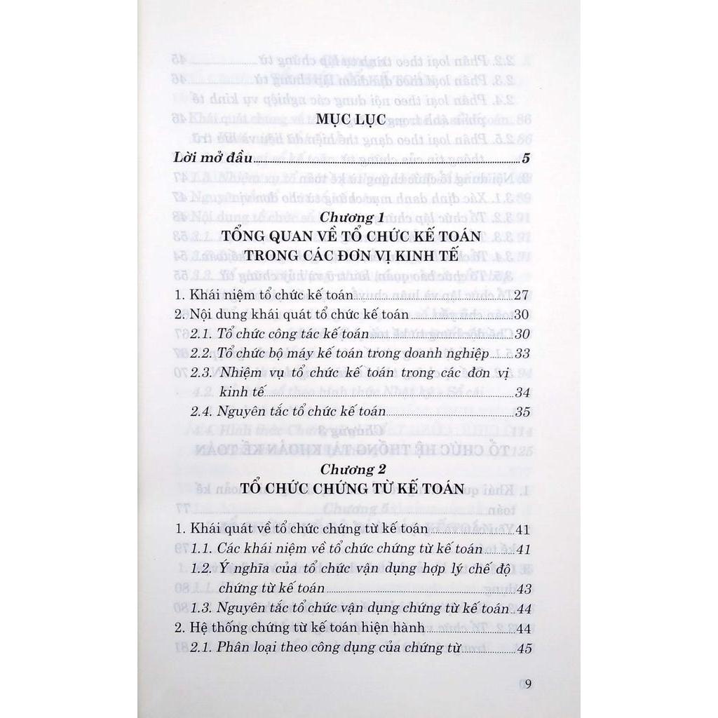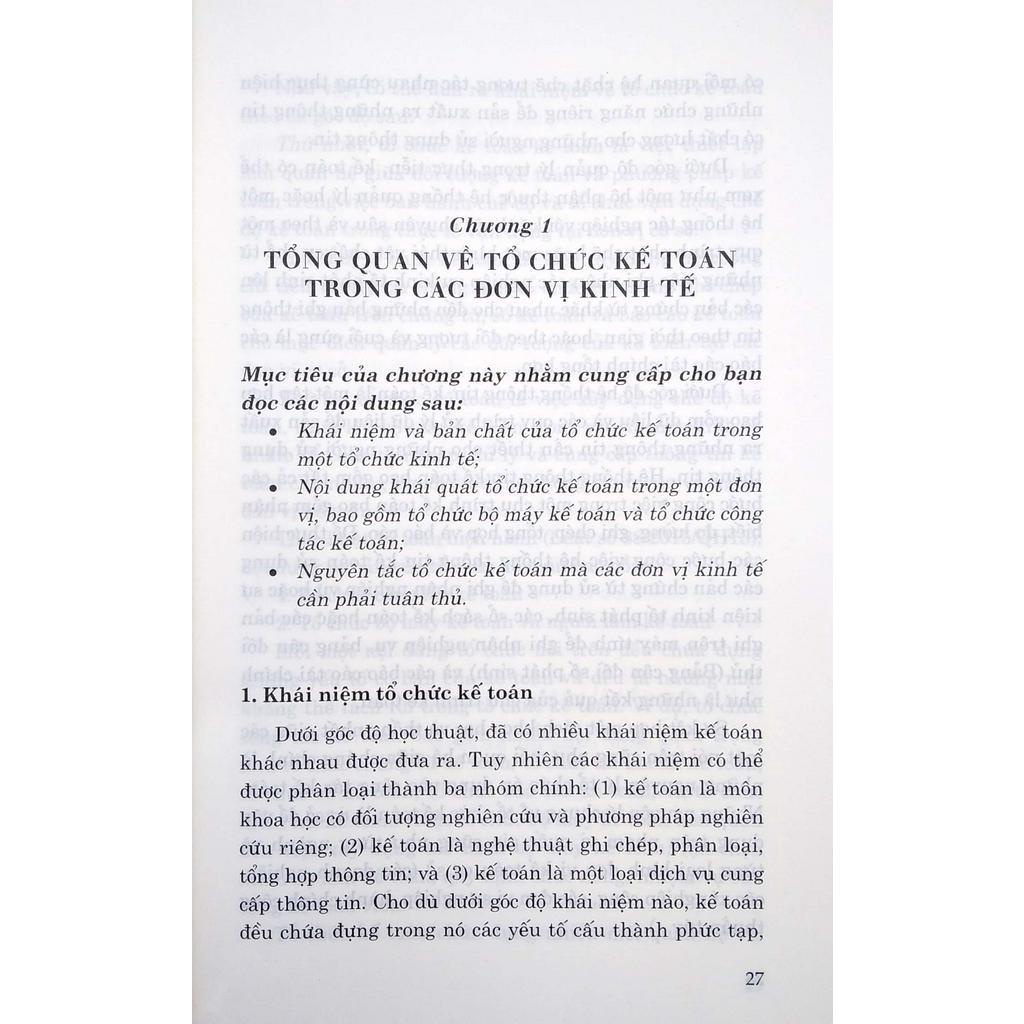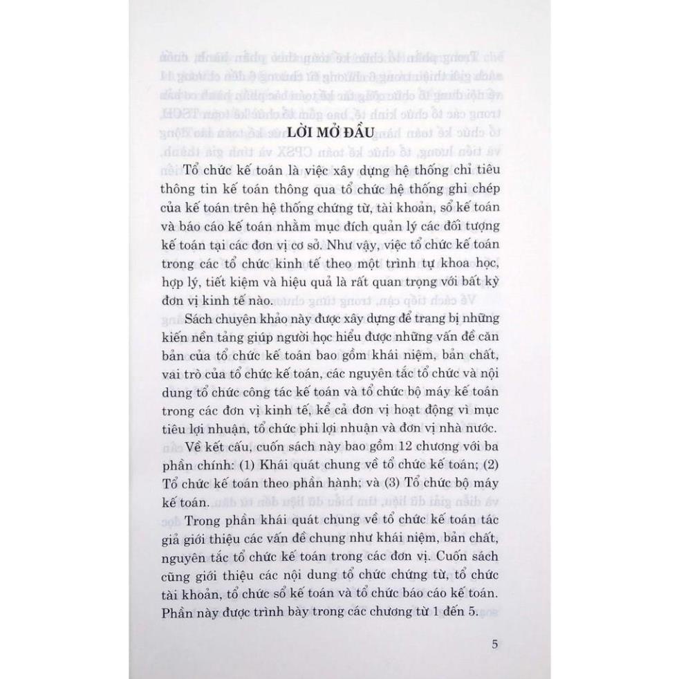 (3) Tổ chức bộ máy kế toán. Trong phần khái quát chung về tổ chức kế toán tác giả giới thiệu các vấn đề chung như khái niệm, bản chất, nguyên tắc tổ chức kế toán trong các đơn vị. Cuốn sách cũng giới thiệu các nội dung tổ chức chứng từ, tổ chức tài khoản, tổ chức sổ kế toán và tổ chức báo cáo kế toán. Phần này được trình bày trong các chương từ 1 đến 5.