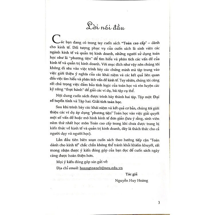 Đối tượng phục vụ của cuốn sách là sinh viên các ngành kinh tế và quản trị kinh doanh, những người sử dụng toán học như là “phương tiện” để tìm hiểu và phân tích các vấn đề của kinh tế và quản trị kinh doanh. Với mục đích như vậy nên chúng tôi không đi sâu vào việc trình bày các chứng minh mà tập trung vào việc giới thiệu ý nghĩa của các khái niệm và các kết quả liên quan đến việc tìm hiểu và phân tích vấn đề kinh tế. Tuy nhiên, chúng tôi cũng rất chú trọng việc đảm bảo tính logic của toán học và rèn luyện các kỹ năng “thực hành” để giải các ví dụ, bài tập cụ thể.