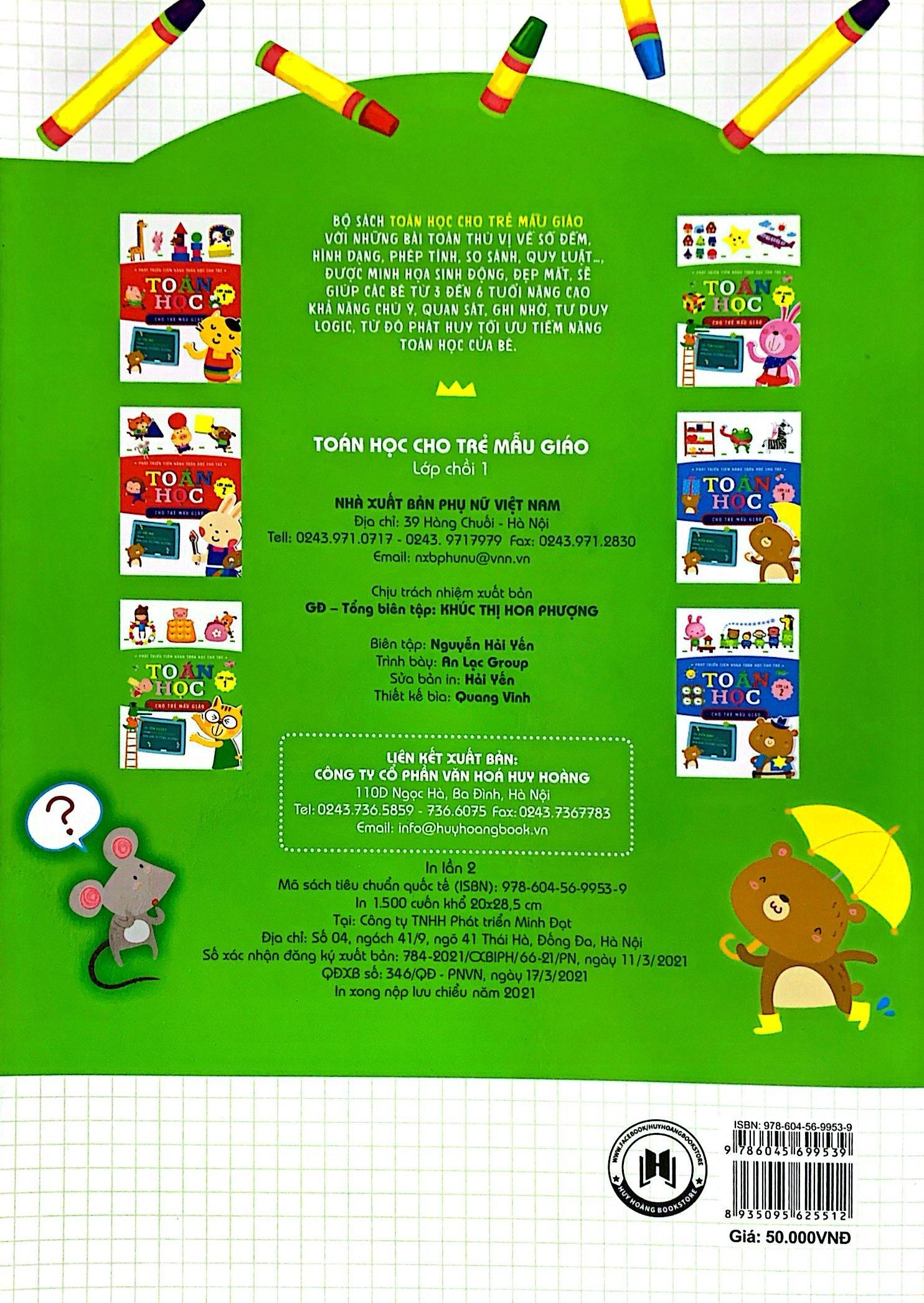 Bộ sách Toán học cho trẻ mẫu giáo mỗi cuốn có lý thuyết (đơn giản) và các bài tập thực hành về số đếm, hình dạng, phép tính, so sánh, quy luật…, được minh họa sinh động, đẹp mắt, thiết kế phù hợp với từng độ tuổi giúp bé nâng cao khả năng quan sát; ghi nhớ và tư duy logic.Bộ sách gồm 6 tập: Lớp mầm 1; Lớp mầm 2 (3-4 tuổi); Lớp chồi 1; Lớp chồi 2 (4-5 tuổi); Lớp lá 1; Lớp lá 2 (5-6 tuổi).
