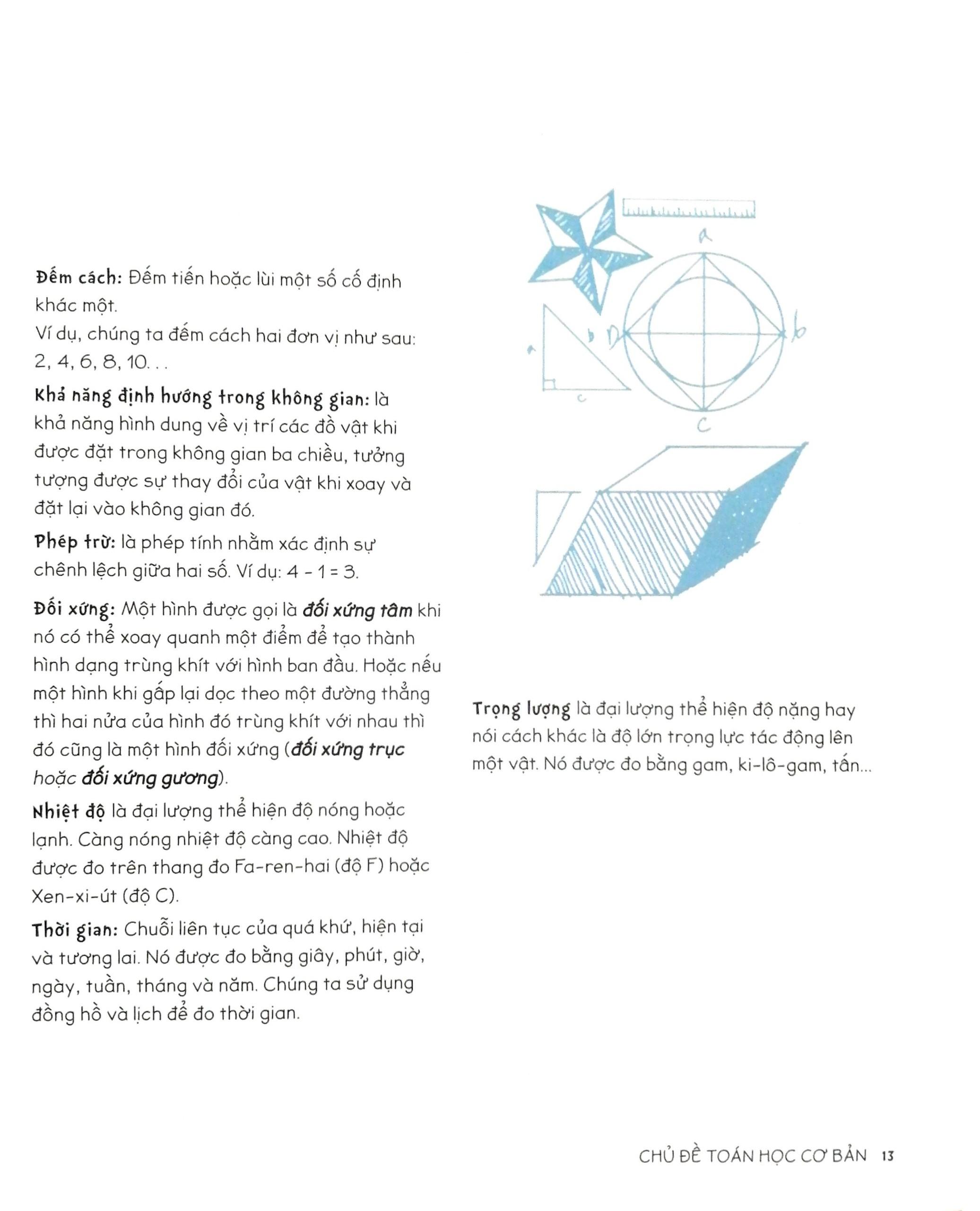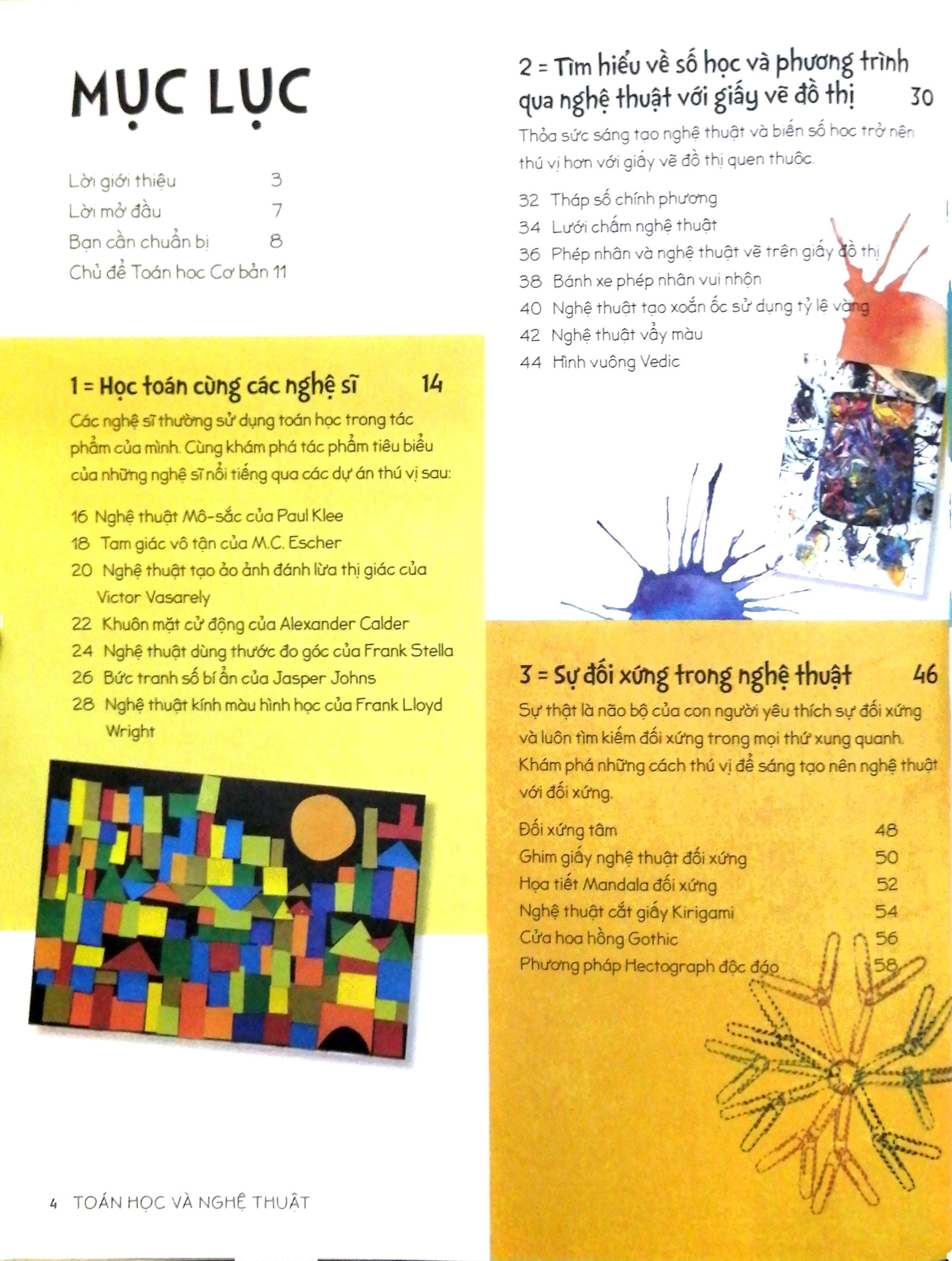 Theo chân tác giả Karyn Tripp, các bạn nhỏ sẽ được trải nghiệm một chuyến hành trình sáng tạo độc đáo với gần 40 dự án theo trong 6 chủ đề hấp dẫn. Mỗi chủ đề là một điểm đến, một câu chuyện kỳ thú đi cùng với một khái niệm Toán học. Từ tam giác vô tận của Escher cho đến bức tranh số bí ẩn của Jasper Johns, các hoạt động thực hành đầy tính logic và sáng tạo sẽ đưa bạn đọc ghé thăm các nét văn hóa đặc sắc nhất trên thế giới với nghệ thuật cắt giấy Kirigami, Mandala cát Tây Tạng, tranh in Kente ở châu Phi và nghệ thuật âm dương của châu Á,…