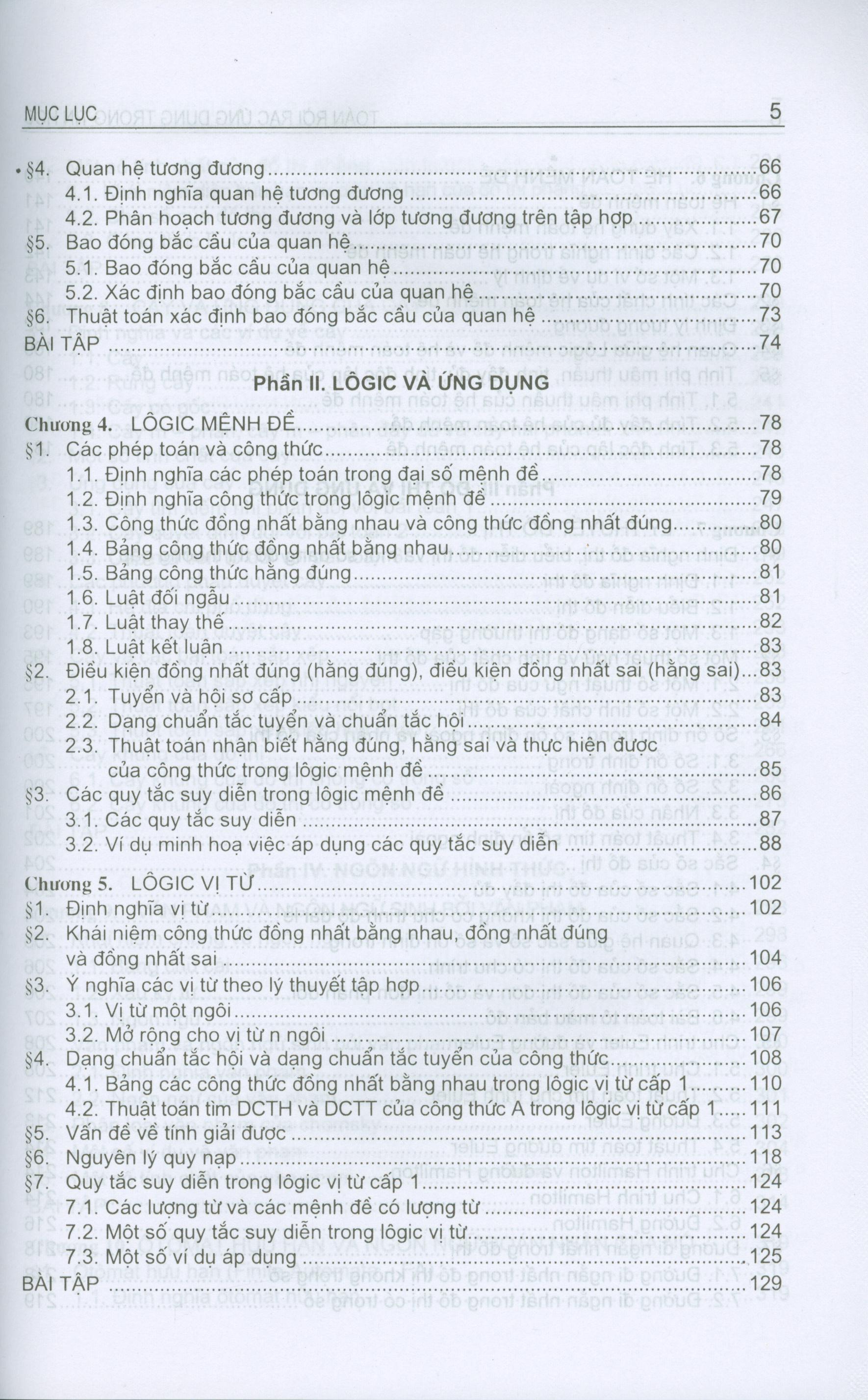 - Phần IV. Ngôn ngữ hình thức. Cuốn Toán rời rạc ứng dụng trong tin hoc trình bày các vấn đề toán học cơ bản nhất, nhưng lại hết sức thiết yếu và cần thiết đối với những ai muốn có được các kiến thức tin học vững chắc. Cuốn sách giúp người học hiểu được lý thuyết thấu đáo, rèn luyện tư duy khoa học, kỹ năng tính toán và khả năng vận dụng toán học vào giải quyết vấn đề, kích thích niềm say mê học tập và từ đó nâng cao kỹ năng thực hành, tư duy sáng tạo khi học các môn học cơ sở và chuyên ngành Công nghệ thông tin tiếp theo. Cuốn sách này cũng rất bổ ích cho việc ôn thi tuyển sinh sau đại học ngành Công nghệ thông tin được tổ chức hàng năm ở Đại học Quốc gia Hà Nội.