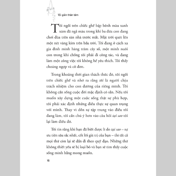 Nhiều người trong chúng ta đang phải chịu gánh nặng của những thứ ta sở hữu, những cam kết, lịch trình và các suy nghĩ trong tâm trí. Trong trạng thái ấy, ta không thể chậm lại và tận hưởng cuộc sống vì quá bận bịu. Trong sâu thẳm, chúng ta e sợ rằng một ngày nào đó ta sẽ thức dậy và nhận ra mình đã bỏ lỡ những năm tháng quý báu đáng ra nên dùng để nuôi nấng các con hoặc có một sức khỏe tốt – tất cả chỉ vì ta đã đặt quá nhiều chú ý vào những thứ không thực sự quan trọng. Vì vậy, đã đến lúc nhường chỗ cho những gì quan trọng thông qua chiến lược tối giản cuộc sống.