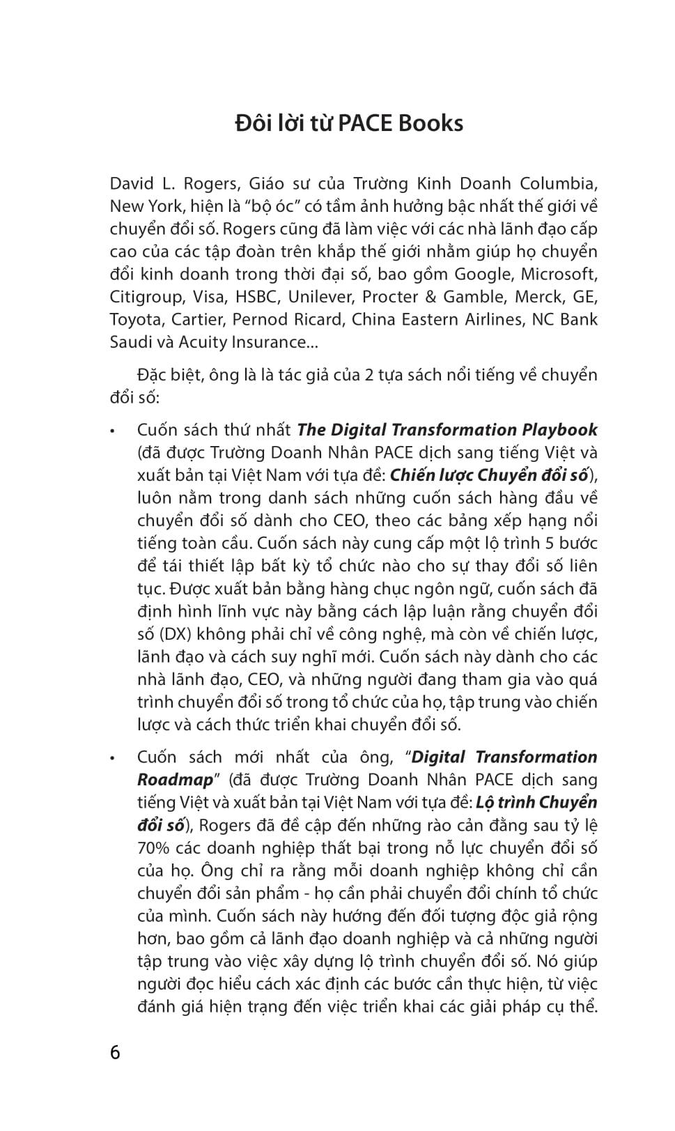 Tác giả David L. Rogers, chuyên gia hàng đầu về chuyển đổi số và là giảng viên của trường Đại học kinh doanh Columbia, đã trực tiếp giảng dạy cho hàng ngàn CEO trên khắp thế giới, trong đó có rất nhiều CEO ở Thung lũng Silicon. Ông cũng đã gặp gỡ, làm việc và tư vấn cho lãnh đạo các tập đoàn hàng đầu thế giới như Google, Microsoft, Unilever, Toyota…