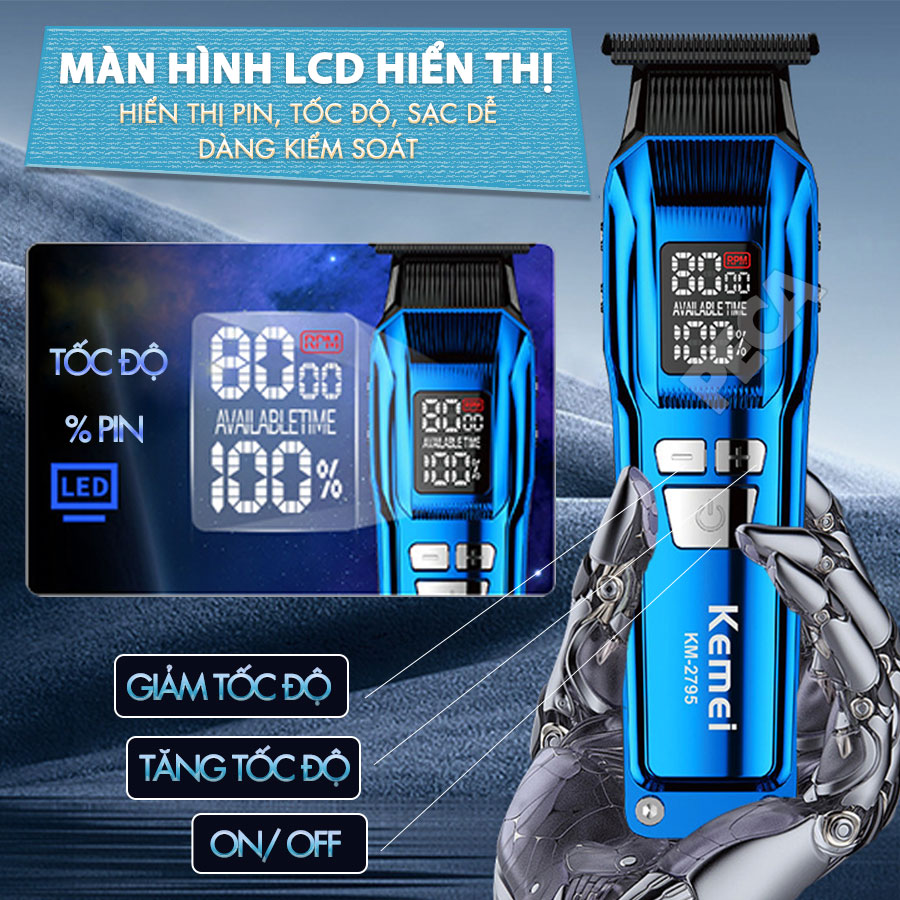 TÔNG ĐƠ CẮT TÓC CHUYÊN NGHIỆP KEMEI KM-2796 CÔNG SUẤT MẠNH 10W ĐIỀU CHỈNH 5 MỨC TỐC ĐỘ, CÓ ĐỘNG CƠ KHÔNG CHỔI THAN, MÀN HÌNH LCD HIỂN THỊ SẠC, LƯỠI CẮT MẠ CARBON DLC CAO CẤP
