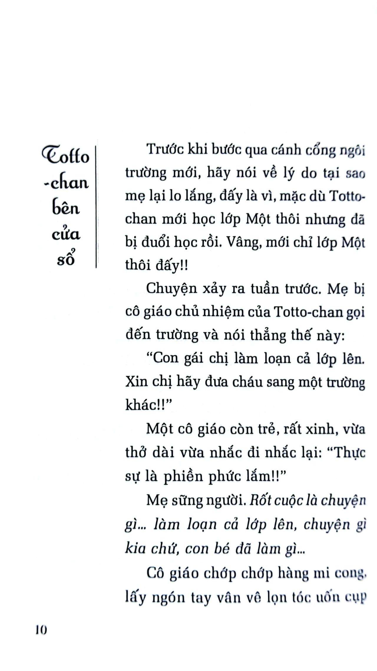 Không còn cách nào khác, mẹ đành đưa Totto-chan đến một ngôi trường mới, trường Tomoe. Đấy là một ngôi trường kỳ lạ, lớp học thì ở trong toa xe điện cũ, học sinh thì được thoả thích thay đổi chỗ ngồi mỗi ngày, muốn học môn nào trước cũng được, chẳng những thế, khi đã học hết bài, các bạn còn được cô giáo cho đi dạo. Đặc biệt hơn ở đó còn có một thầy hiệu trưởng có thể chăm chú lắng nghe Totto-chan kể chuyện suốt bốn tiếng đồng hồ! Chính nhờ ngôi trường đó, một Totto-chan hiếu động, cá biệt đã thu nhận được những điều vô cùng quý giá để lớn lên thành một con người hoàn thiện, mạnh mẽ.