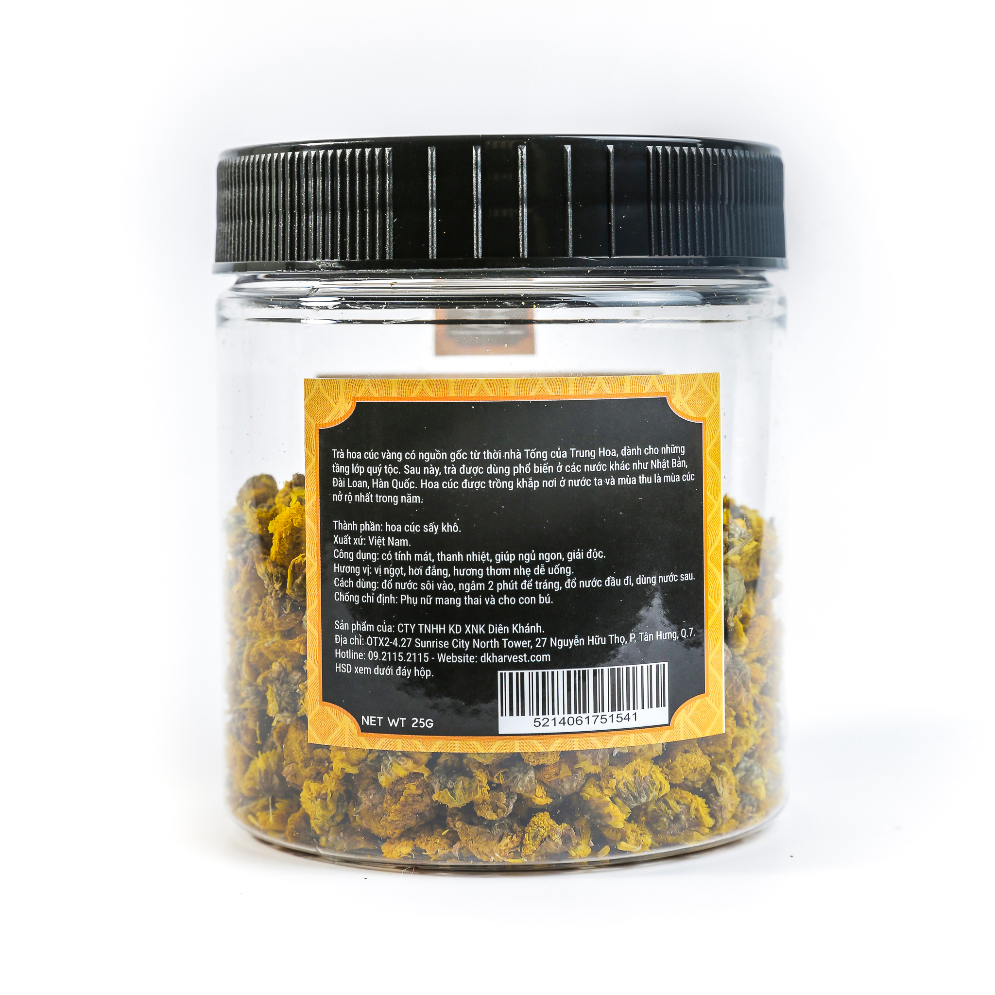 Trà Hoa Cúc Vàng Sấy Khô Nguyên Bông DK Harvest Hoa cúc là cái tên quen thuộc mà ai cũng biết, được biết đến như một loại hoa để trang trí rất phổ biến nhưng ít ai biết được những công dụng khác của hoa cúc khô với sức khỏe. Trà hoa cúc sấy khô nguyên bông là một loại trà thảo mộc có nguồn gốc hoàn toàn từ thiên nhiên được làm từ chính những bông hoa cúc đẹp nhất, tốt nhất. Trà có tính mát, giúp thanh nhiệt và giải độc cho cơ thể rất hiệu quả, là loại trà rất phù hợp với những người bị thiếu ngủ, khó ngủ. Trà hoa cúc vàng DK Harvest Thành phần của trà hoa cúc