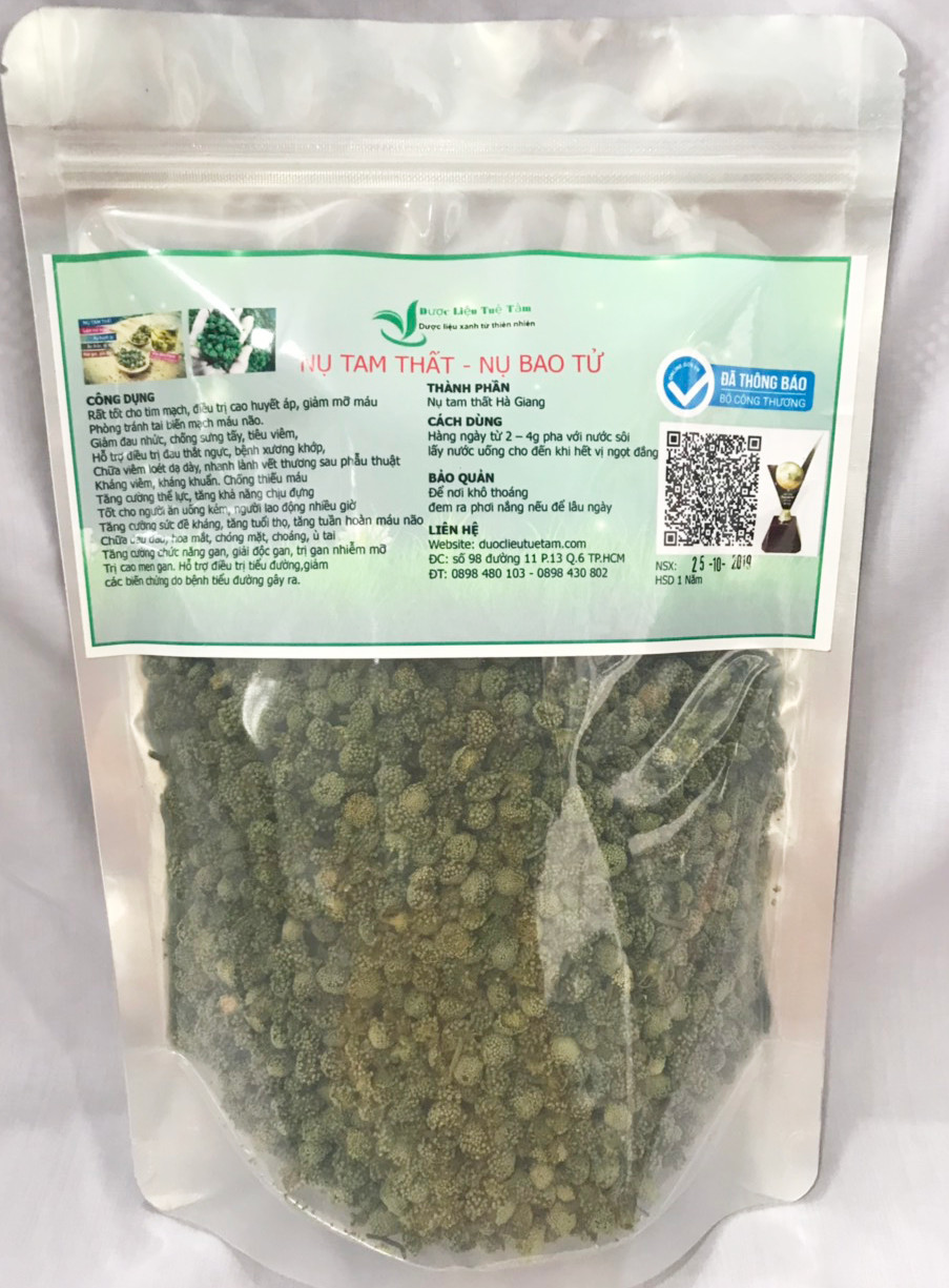 - Rất tốt cho phụ nữ sau khi sinh, đặc biệt phụ nữ dùng nụ tam thất bao tử có tác dụng làm đẹp da, chống lão hóa, trị nám, trị mụn Nụ hoa tam thất khi pha trà Hướng dẫn dử dụng nụ hoa tam thất Chỉ cần lấy vài nụ hoa tam thất cho vào cốc nước sôi, hãm như hãm trà mạn uống đến khi nào trà hết vị ngọt đắng thì thay bằng ấm mới. Trà Hoa tam thất có vị ngọt hơi đắng, hương thơm thanh mát nên rất dễ uống, có thể sử dụng hàng ngày từ 2 – 4g pha với nước sôi lấy nước uống cho đến khi hết vị ngọt đắng thì thôi NỤ HOA TAM THẤT TUỆ TÂM Sản phẩm dược thu hái tự nhiên 100% Đảm bảo ATVSTP được kiểm nghiệm sản phẩm đầy đủ theo quy dịnh Lọai nụ trà loại 1 không có cộng cao cấp nhất Sản phẩm được xuất khẩu đi gần 10 nước trên thế giới