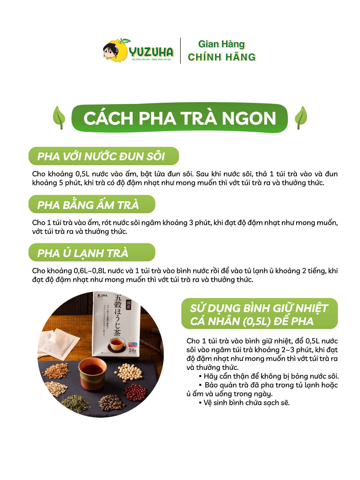 TRÀ XANH HOJI NGŨ CỐC Thành phần: Trà xanh Hoji (40%) (sản xuất trong nước), lúa mạch (25%) (sản xuất trong nước), hạt ý dĩ hatomugi (15%) (sản xuất trong nước), trà Cassia nomame (10%)