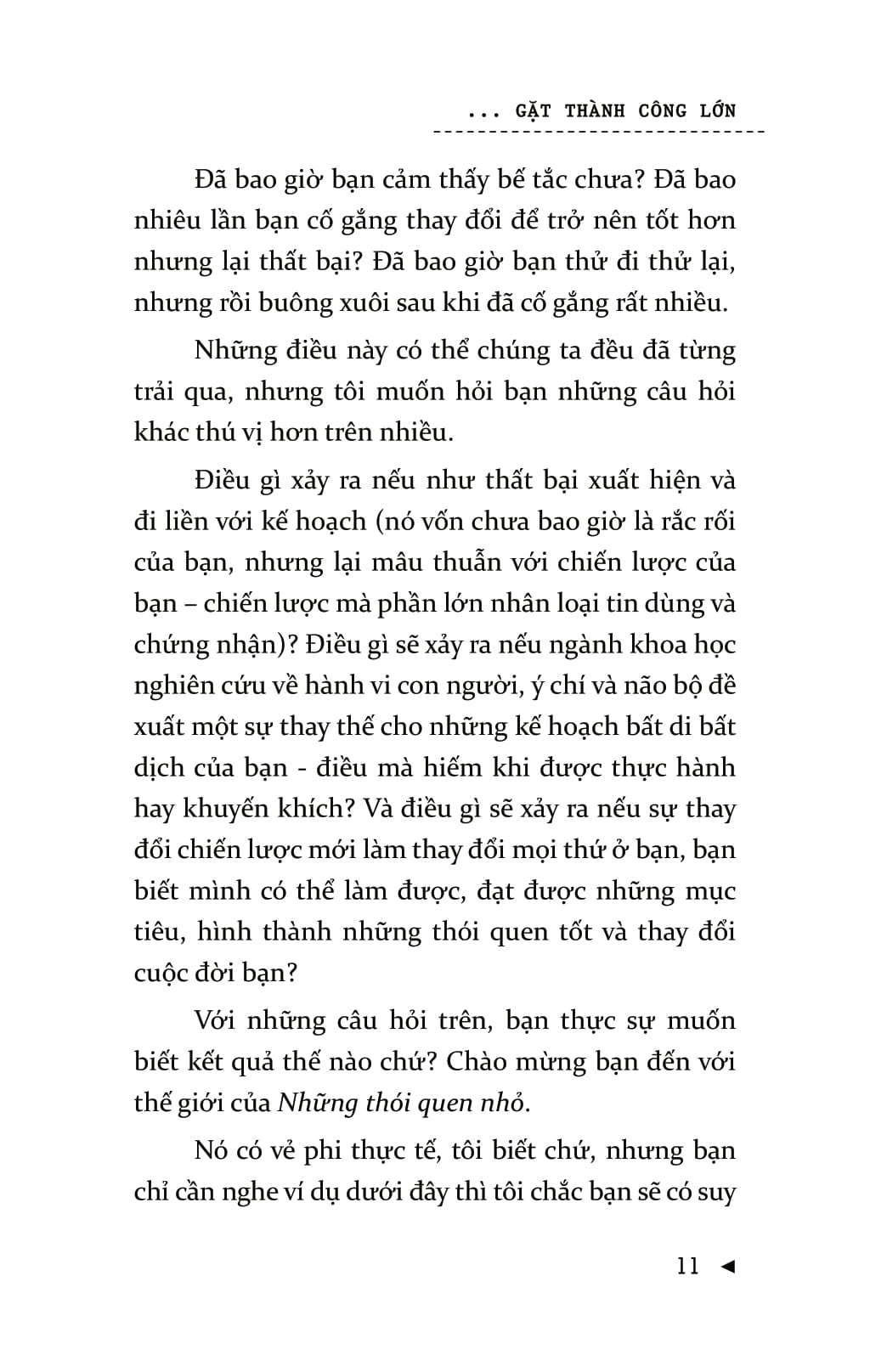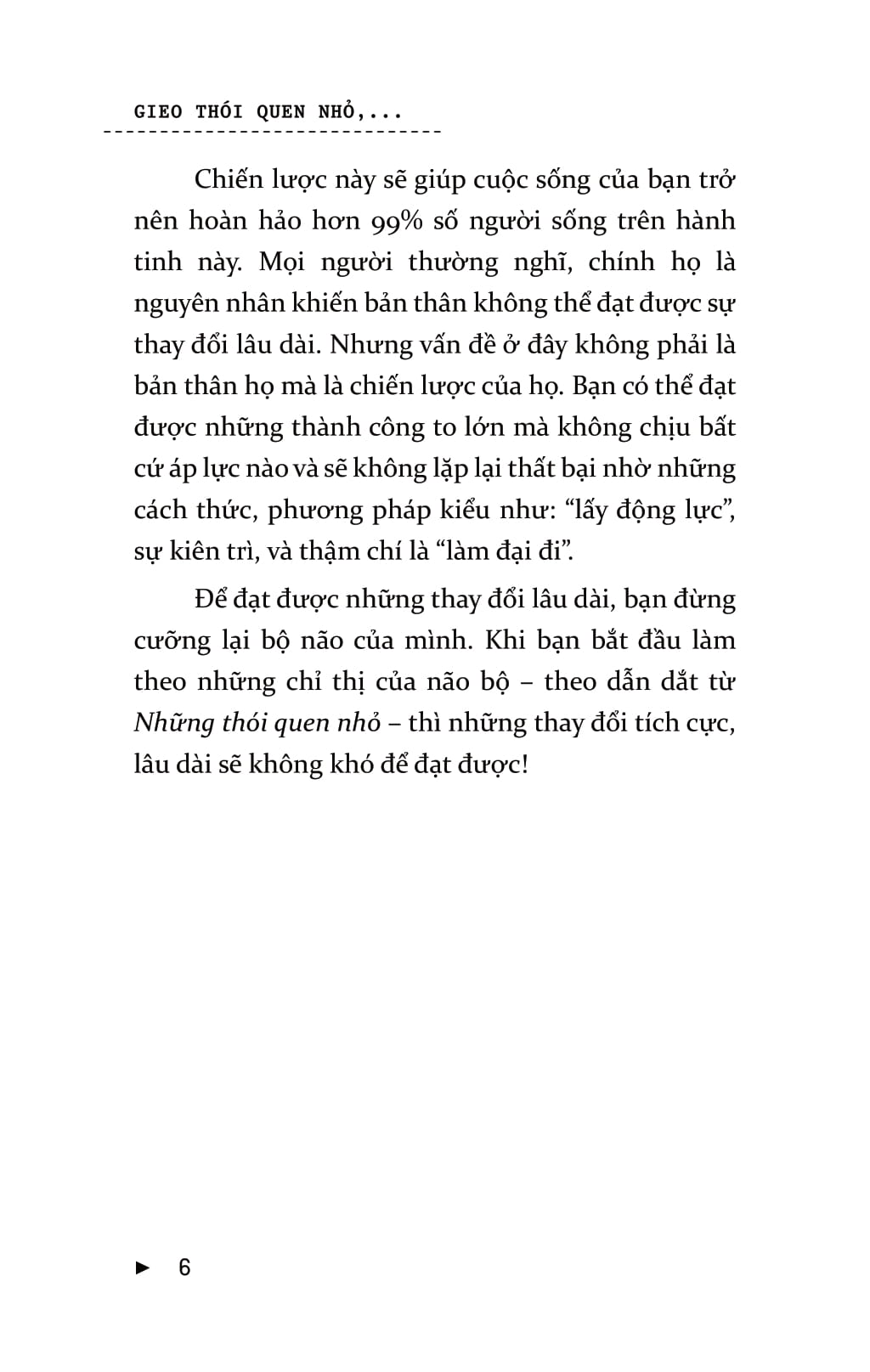 Mọi người thường nghĩ, chính họ là nguyên nhân khiến bản thân không thể đạt được sự thay đổi lâu dài. Nhưng vấn đề ở đây không phải là bản thân họ mà là chiến lược của họ. Bạn có thể đạt được những thành công to lớn mà không chịu bất cứ áp lực nào và sẽ không lặp lại thất bại nhờ những cách thức, phương pháp kiểu như: “lấy động lực”, sự kiên trì, và thậm chí là “làm đại đi”. Để đạt được những thay đổi lâu dài, bạn đừng cưỡng lại bộ não của mình. Khi bạn bắt đầu làm theo những chỉ thị của não bộ – theo dẫn dắt từ Gieo thói quen nhỏ gặt thành công lớn – thì những thay đổi tích cực, lâu dài sẽ không khó để đạt được! Gieo thói quen nhỏ gặt thành công lớn là cuốn sách khoa học tìm ra sự mâu thuẫn trong hầu hết các chiến lược phát triển bản thân và lý giải nguyên nhân tại sao các thói quen nhỏ lại tạo nên sự thống nhất rõ rệt. Một thói quen nhỏ là hành vi tích cực rất nhỏ mà bạn bắt bản thân phải làm mỗi ngày. Nó “quá nhỏ để thất bại” nhưng lại mạnh mẽ không thể lường trước và là một chiến lược góp phần hình thành nên thói quen ưu việt.Cuốn sách gồm có bảy phần chính. Ba phần đầu của cuốn sách bàn về việc xây dựng thói quen, bộ não, ý chí, động lực và chỉ ra cách chúng liên hệ với nhau. Hai phần tiếp theo bàn về các kết luận mang tính lô-gic và cách khai thác một cách khoa học nhất những thông tin cung cấp. Ba phần cuối hướng dẫn bạn áp dụng những cách thức đó trong cuộc sống.Chiến lược này sẽ giúp cuộc sống của bạn trở nên hoàn hảo hơn 99% số người sống trên hành tinh này.