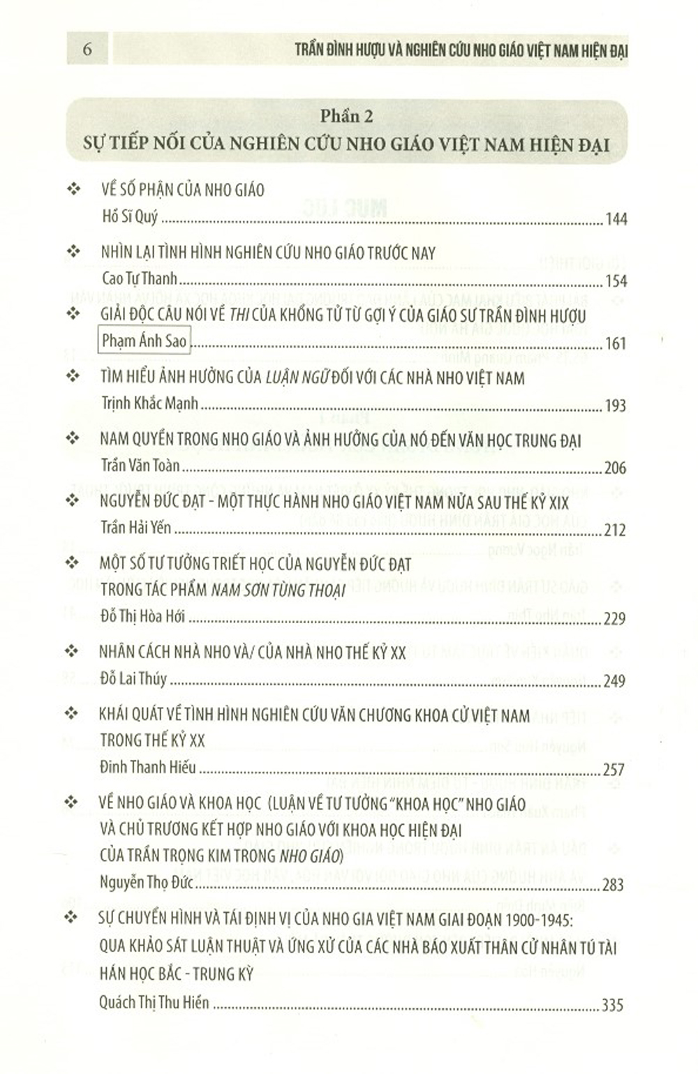 Sự phục hưng của một phong trào Tân Nho giáo như vậy dần dần được sự cộng hưởng mạnh mẽ, đến mức mà vào năm 1996, Đại hội của phong trào Tân Nho giáo quốc tế lần thứ VI đã được tổ chức trọng thể tại Thượng Hải, với sự có mặt và diễn văn chào mừng của Tổng Bí thư Đảng Cộng sản Trung Quốc Giang Trạch Dân. Từ đầu những năm 90 thế kỷ trước, nghiên cứu Nho giáo không còn bị kỳ thị hay tìm cách hạn chế nữa. | Trần Đình Hượu bắt đầu nghiên cứu Trung Quốc nói chung, Nho giáo nói riêng từ cuối những năm 50 của thế kỷ trước. Được cử đi đào tạo ở Liên Xô rồi về nước từ năm 1964, ông liên tục giảng dạy và nghiên cứu ở Khoa Ngữ văn Trường Đại học Tổng hợp Hà Nội, cho đến năm 1993. Những công trình nghiên cứu chính của ông về Nho giáo, vì bối cảnh
