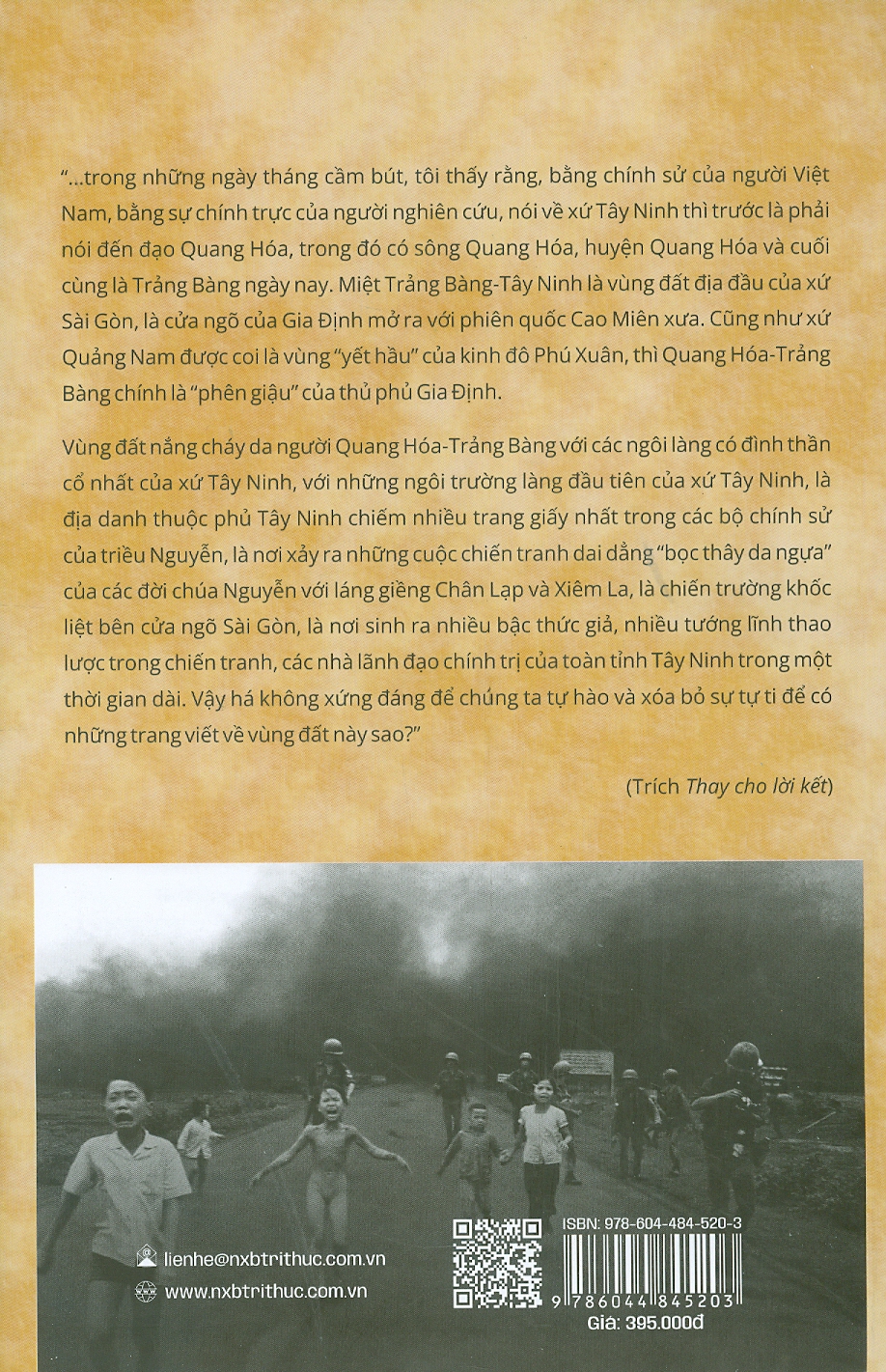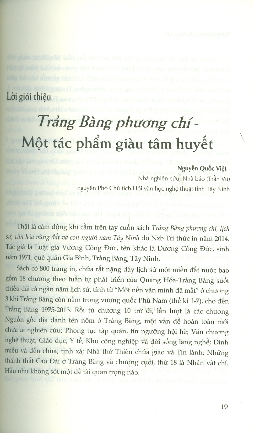 Tuy nhiên, do có quá nhiều sự thay đổi trong địa giới hành chính, tên gọi, sự thiếu hụt các tư liệu lịch sử để làm sáng tỏ các tồn nghi, nên không gian và thời gian liên quan đến Trảng Bàng khó có thể hoàn toàn chính xác. Nhưng dẫu sao các sự kiện chính yếu và mang tính bước ngoặt thì với trách nhiệm của mình, tác giả hết sức cố gắng để phản ánh trung thực, đầy đủ nhất. Song, do phạm vi không gian và thời gian khá rộng và kéo dài, cuốn sách không thể trình bày đầy đủ diện mạo của xứ Trảng, mà chỉ là những gì được ghi nhận từ nhận thức, tình cảm của tác giả và từ tài liệu khảo cứu có được mà thôi.