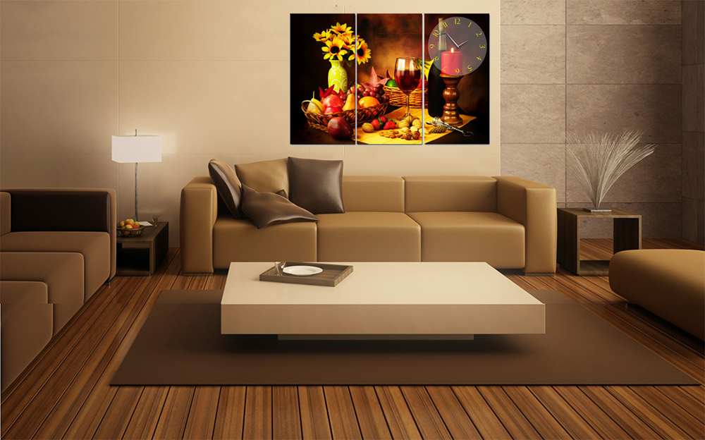Tranh treo là sự kết hợp tinh tế giữa đồng hồ cùng tranh nghệ thuật đặc sắc. Tranh là sự tái hiện sinh động một bàn ăn kiểu Tây với rượu vang, trái cây cùng ánh nến dịu nhẹ, cùng với cách phối màu mang phong cách cổ điển càng làm tăng thêm sự sang trọng cho bố cục của tranh. Chất liệu PP cao cấp cùng kĩ thuật in tiên tiến  cho ảnh chất lượng cao, không bị nhòe ảnh, bể ảnh, màng bảo vệ bóng mờ gia tăng khả năng chịu nước, chống bay màu tốt.=