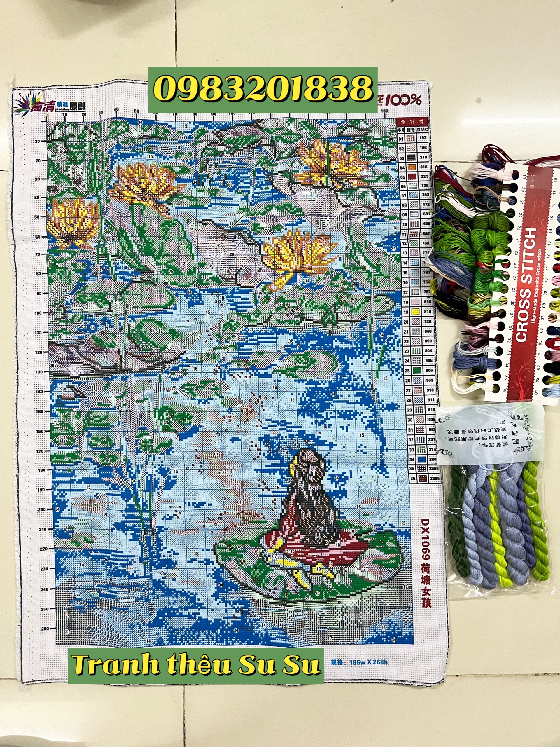 Tên tranh: Tranh thêu kín Cô gái ao sen DX1069