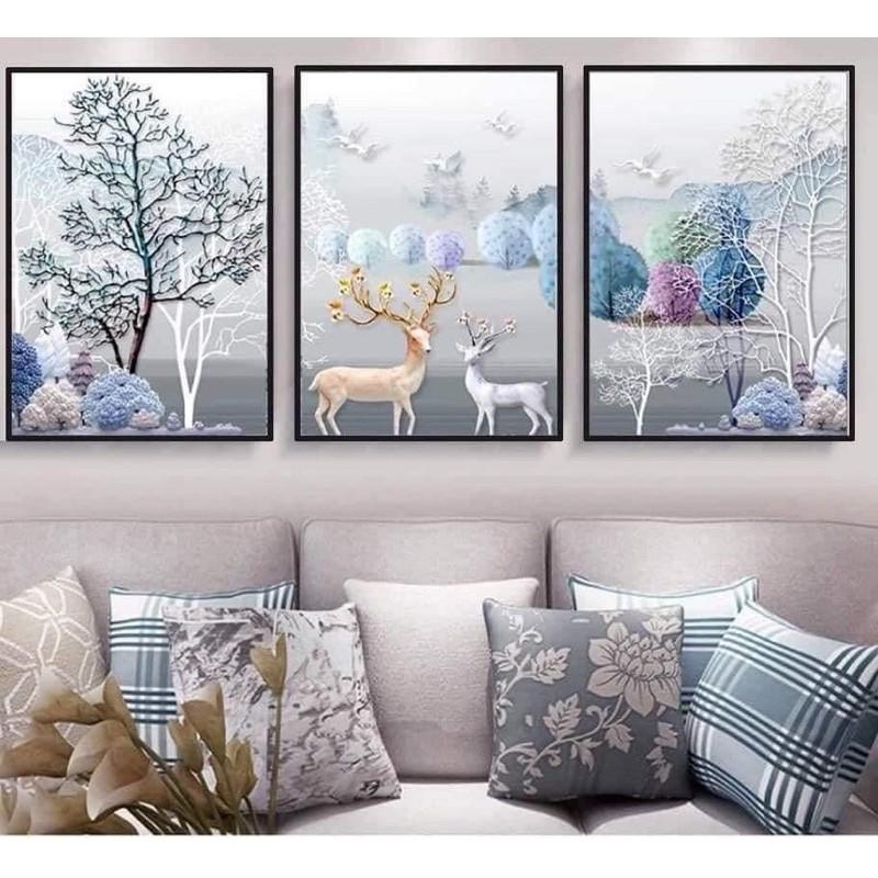 Tranh treo tường trang trí hươu nghệ thuật - Kích thước của tranh : Size 1 :50x70cmx 1 tấm +30x50x2 tấm Size 2 :60x80cm x 1 tấm +40x60x2 tấm - Chất liệu : Tráng gương