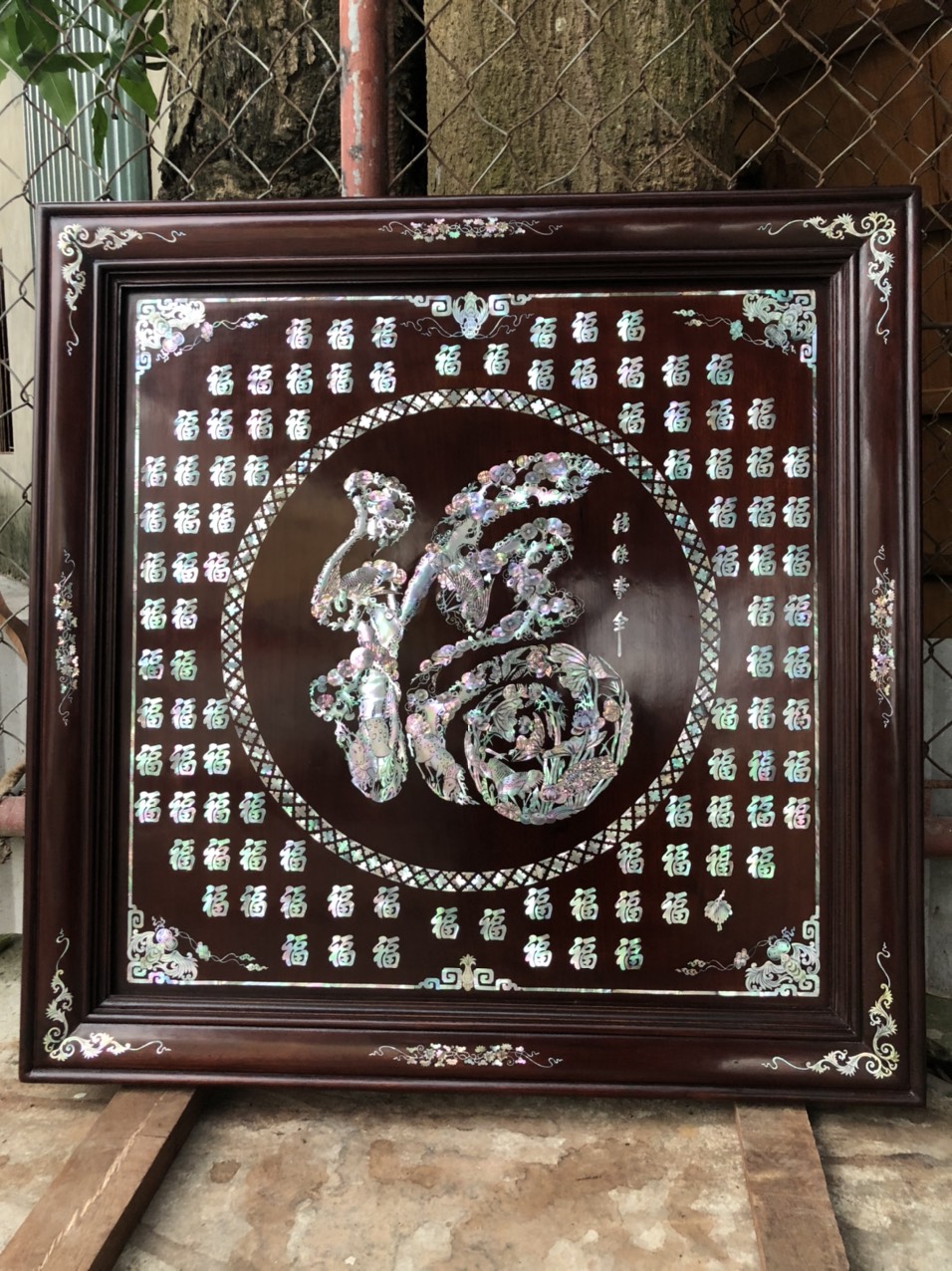 Tranh treo tường chữ bách phúc được khảm xà cừ làm bằng chất liệu ốc biển .Kết hợp với lền gỗ gụ tự nhiên 100% ,Tranh được nhuộm mầu đánh bét ni làm mầu mận chín giả cổ Kích thước mặt vuông 81×81×4cm _ Tranh treo tường bách phúc phúc được trạm khắc cắt tỉa các xà cừ li ti tỉ mỉ tinh sảo kỳ công đi hầu hết tất cả mọi chi tiết góc ngách của tấm tranh đều được ngọt tỉa chỉnh sửa hoàn toàn bằng tay thủ công .Từ những người thợ giàu kinh nghiệm Cũng như tay nghề cao trong làng nghề truyền thống .Chính vì thế tấm tranh bách phúc đã đáp ứng đầy đủ những tiêu trí ( Đẹp bền rẻ ) Thẩm mỹ nghệ thuật với chất lượng tuyệt vời